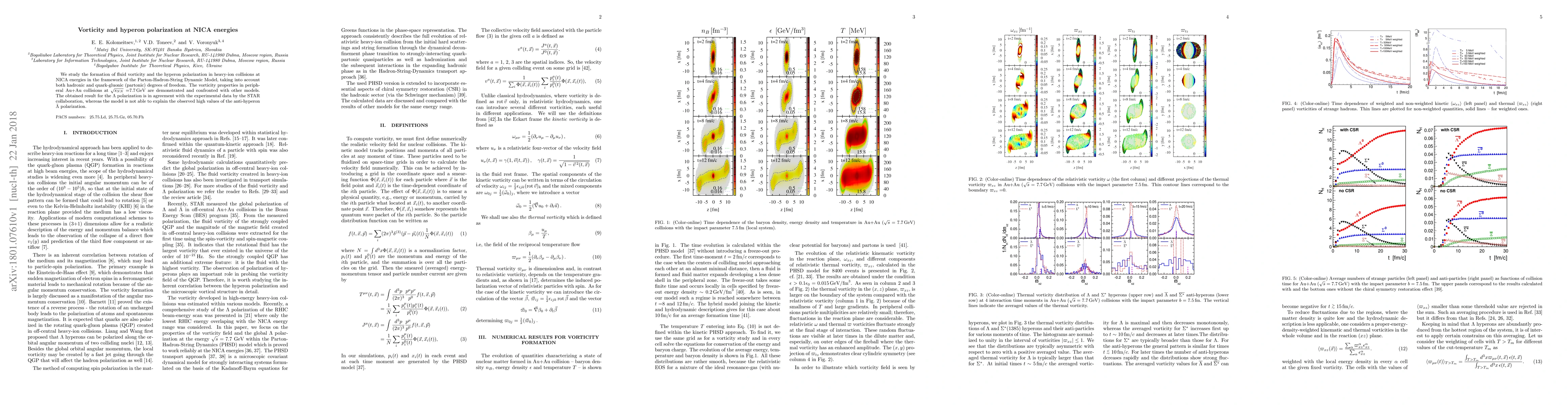 We study the formation of fluid vorticity and the hyperon polarization in heavy-ion collisions at NICA energies in the framework of the Parton-Hadron-String Dynamic Model, taking into account both hadronic and quark-gluonic (partonic) degrees of freedom. The vorticity properties in peripheral Au+Au collisions at $\sqrt{s_{NN}}=$7.7\,GeV are demonstrated and confronted with other models. The obtained result for the $\Lambda$ polarization is in agreement with the experimental data by the STAR collaboration, whereas the model is not able to explain the observed high values of the anti-hyperon $\bar\Lambda$ polarization.
