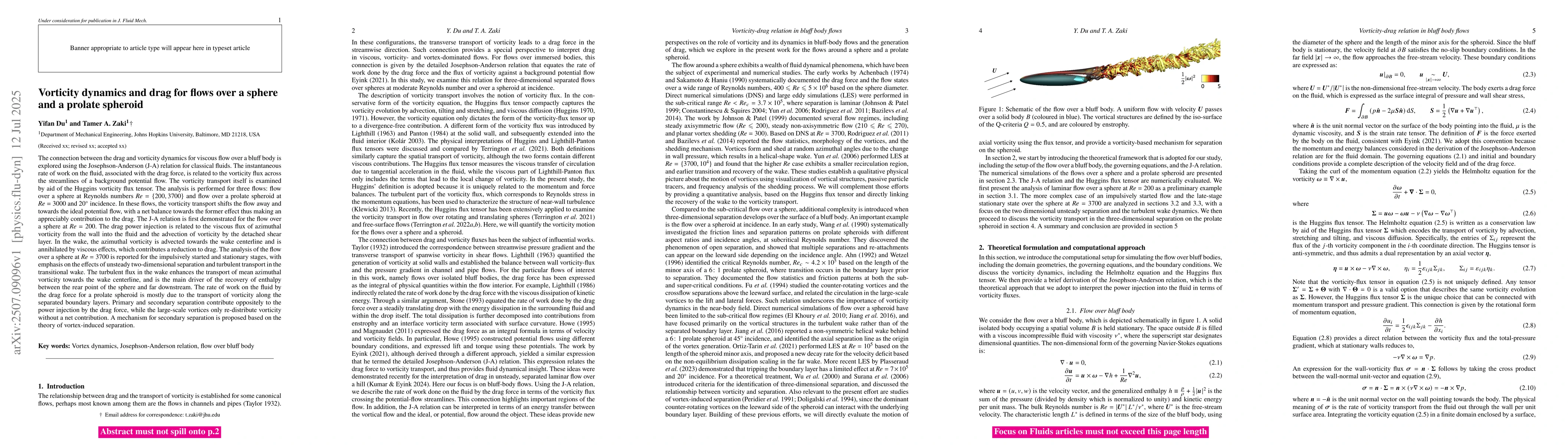 The connection between the drag and vorticity dynamics for viscous flow over a bluff body is explored using the Josephson-Anderson (J-A) relation for classical fluids. The instantaneous rate of work on the fluid, associated with the drag force, is related to the vorticity flux across the streamlines of a background potential flow. The vorticity transport itself is examined by aid of the Huggins vorticity flux tensor. The analysis is performed for three flows: flow over a sphere at Reynolds numbers $Re=\{200,3700\}$ and flow over a prolate spheroid at $Re=3000$ and $20^{\circ}$ incidence. In these flows, the vorticity transport shifts the flow away and towards the ideal potential flow, with a net balance towards the former effect thus making an appreciably contribution to the drag. The J-A relation is first demonstrated for the flow over a sphere at $Re=200$. The drag is related to the viscous flux of azimuthal vorticity from the wall into the fluid and the advection of vorticity by the shear layer. In the wake, the azimuthal vorticity is advected towards the wake centerline and is annihilated by viscous effects, which contributes a reduction to drag. The analysis of the flow over a sphere at $Re=3700$ is reported for the impulsively started and stationary stages, with emphasis on the effects of unsteady separation and turbulent transport in the wake. The turbulent flux in the wake enhances the transport of mean azimuthal vorticity towards the wake centerline, and is the driver of the recovery of enthalpy downstream. The drag force for a prolate spheroid is mostly due to the transport of vorticity along the separated boundary layers. Primary and secondary separation contribute oppositely to the drag force, while the large-scale vortices only re-distribute vorticity. A mechanism for secondary separation is proposed based on the theory of vortex-induced separation.