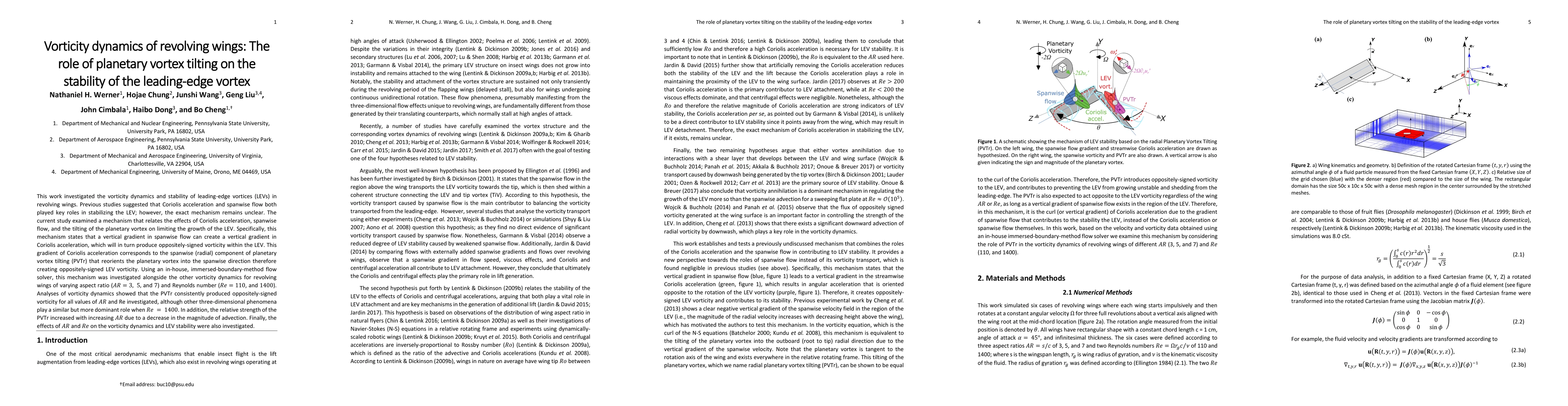 This work investigated the vorticity dynamics and stability of leading-edge vortices (LEVs) in revolving wings. Previous studies suggested that Coriolis acceleration and spanwise flow both played key roles in stabilizing the LEV; however, the exact mechanism remains unclear. The current study examined a mechanism that relates the effects of Coriolis acceleration, spanwise flow, and the tilting of the planetary vortex on limiting the growth of the LEV. Specifically, this mechanism states that a vertical gradient in spanwise flow can create a vertical gradient in Coriolis acceleration, which will in turn produce oppositely-signed vorticity within the LEV. This gradient of Coriolis acceleration corresponds to the spanwise (radial) component of planetary vortex tilting (PVTr) that reorients the planetary vortex into the spanwise direction therefore creating oppositely-signed LEV vorticity. Using an in-house, immersed-boundary-method flow solver, this mechanism was investigated alongside the other vorticity dynamics for revolving wings of varying aspect ratio (AR=3, 5, and 7) and Reynolds number (Re=110, and 1400). Analyses of vorticity dynamics showed that the PVTr consistently produced oppositely-signed vorticity for all values of AR and Re investigated, although other three-dimensional phenomena play a similar but more dominant role when Re = 1400. In addition, the relative strength of the PVTr increased with increasing AR due to a decrease in the magnitude of advection. Finally, the effects of AR and Re on the vorticity dynamics and LEV stability were also investigated.