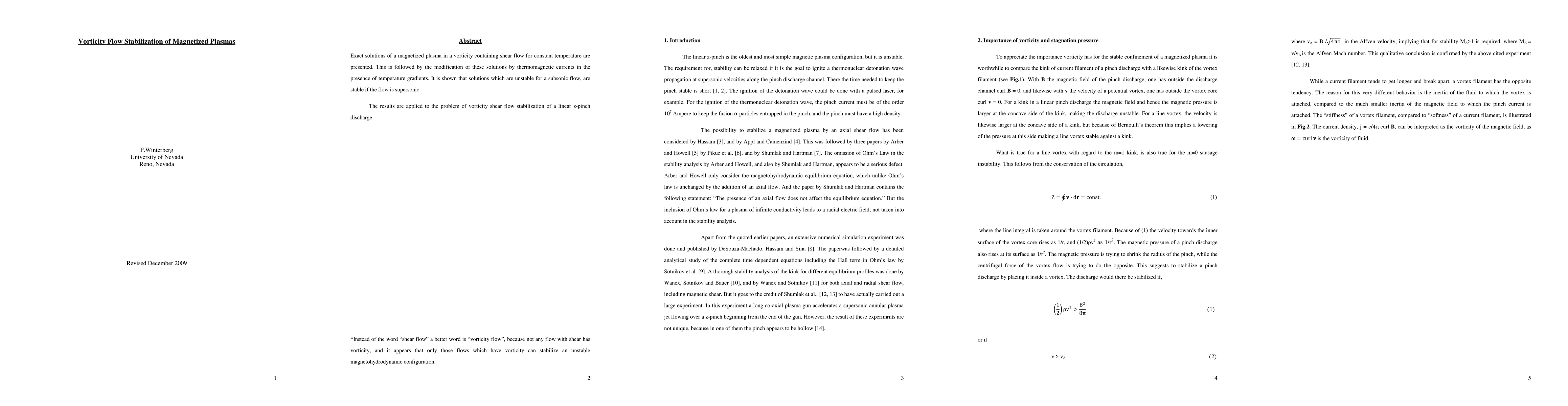 This paper presents exact solutions for magnetized plasmas in shear flow with vorticity, demonstrating that thermomagnetic currents can stabilize previously unstable subsonic flows when the flow becomes supersonic. The findings are applied to stabilize linear z-pinch discharges.