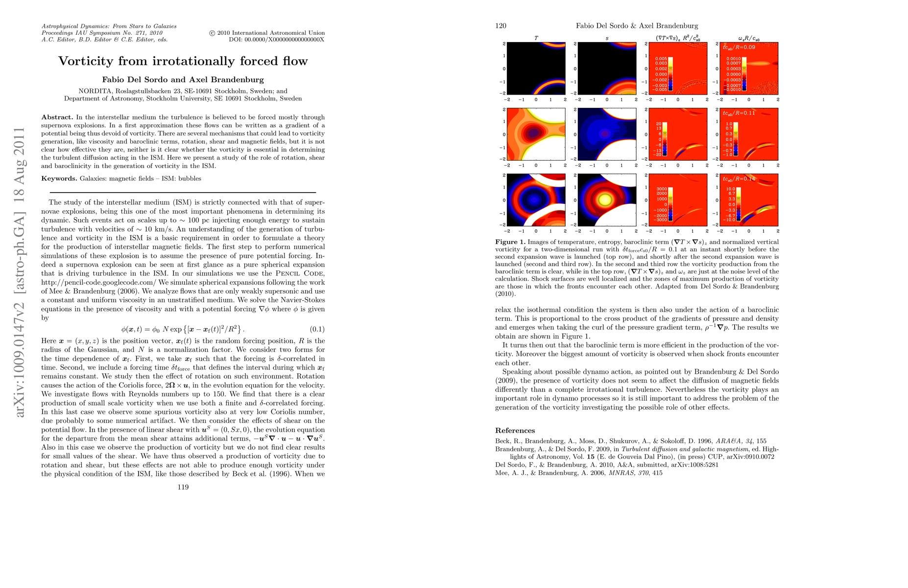 In the interstellar medium the turbulence is believed to be forced mostly through supernova explosions. In a first approximation these flows can be written as a gradient of a potential being thus devoid of vorticity. There are several mechanisms that could lead to vorticity generation, like viscosity and baroclinic terms, rotation, shear and magnetic fields, but it is not clear how effective they are, neither is it clear whether the vorticity is essential in determining the turbulent diffusion acting in the ISM. Here we present a study of the role of rotation, shear and baroclinicity in the generation of vorticity in the ISM.