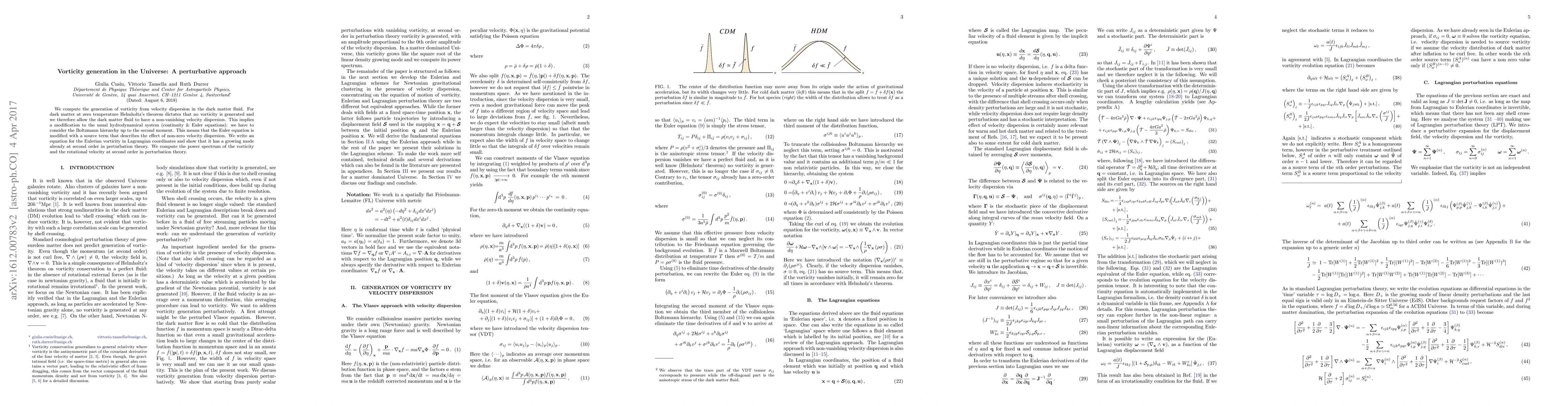 This paper presents a perturbative approach to compute vorticity generation from dark matter velocity dispersion, modifying the Euler equation with a source term. It demonstrates a growing mode for Eulerian vorticity at second order, and calculates the power spectrum of vorticity and rotational velocity in this context.