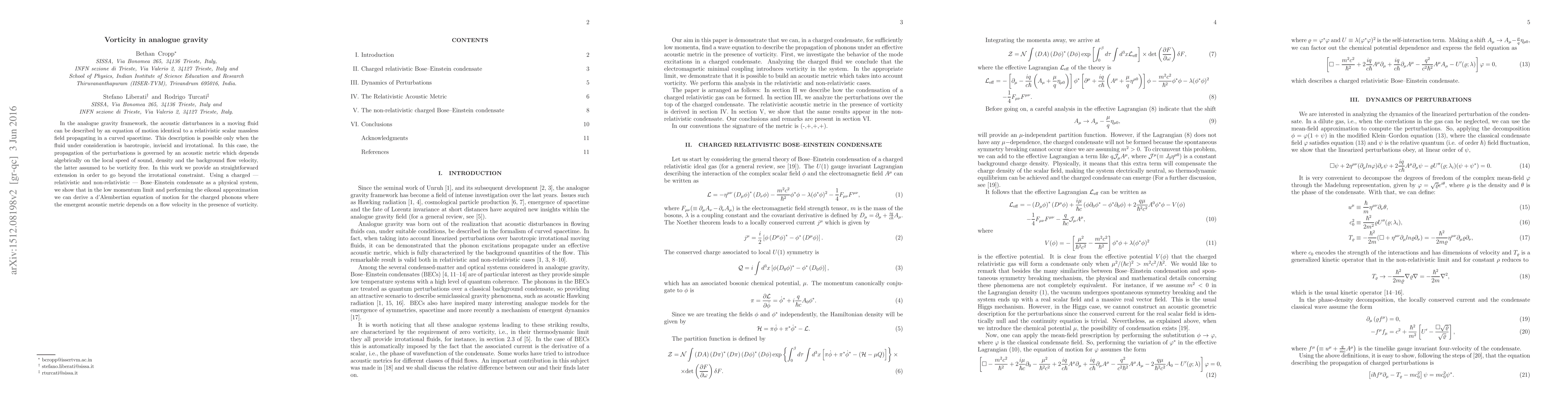 This paper extends the analogue gravity framework to include vorticity in a moving fluid, previously restricted to irrotational conditions. By using a charged Bose-Einstein condensate, the authors derive a d'Alembertian equation for phonons that incorporates an acoustic metric dependent on flow velocity with vorticity, thus broadening the applicability of analogue gravity models.