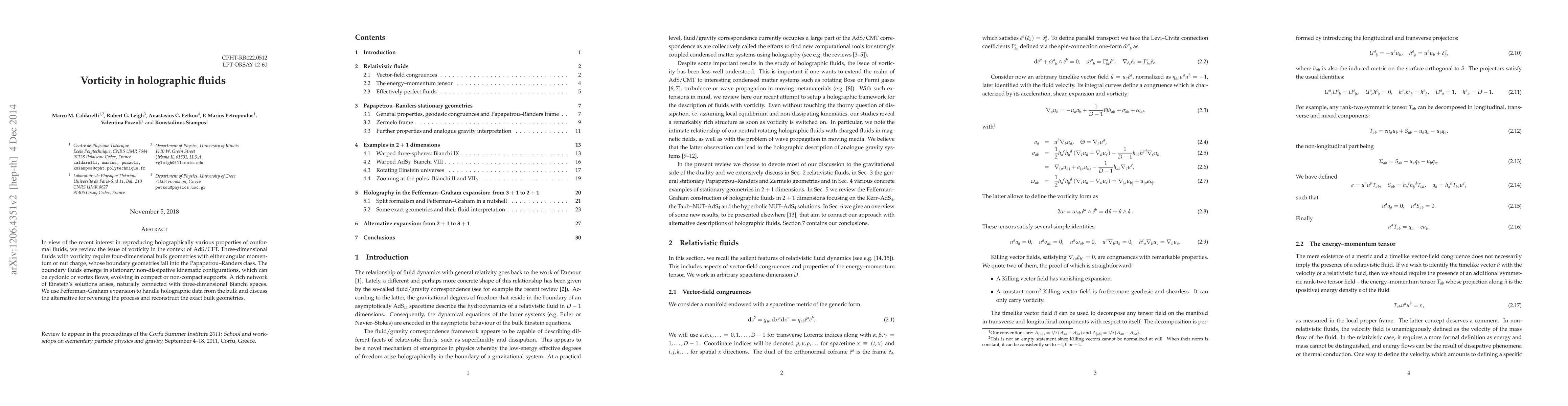 The paper presents a comprehensive review of vorticity in holographic fluids, connecting three-dimensional fluids with vorticity to four-dimensional bulk geometries and using the Fefferman-Graham expansion for handling holographic data.