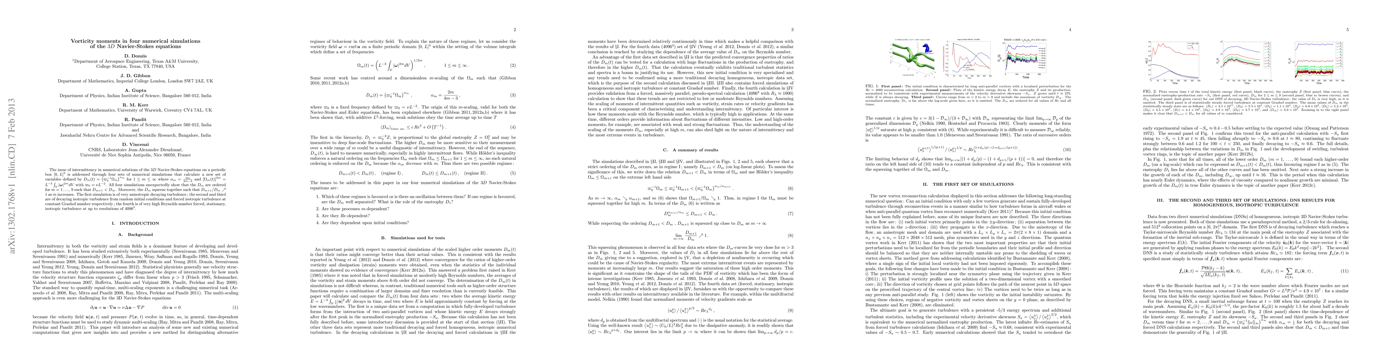 The issue of intermittency in numerical solutions of the 3D Navier-Stokes equations on a periodic box $[0,\,L]^{3}$ is addressed through four sets of numerical simulations that calculate a new set of variables defined by $D_{m}(t) = \left(\varpi_{0}^{-1}\Omega_{m}\right)^{\alpha_{m}}$ for $1 \leq m \leq \infty$ where $\alpha_{m}= \frac{2m}{4m-3}$ and $\left[\Omega_{m}(t)\right]^{2m} = L^{-3}\I |\bom|^{2m}dV$ with $\varpi_{0} = \nu L^{-2}$. All four simulations unexpectedly show that the $D_{m}$ are ordered for $m = 1\,,...,\,9$ such that $D_{m+1} < D_{m}$. Moreover, the $D_{m}$ squeeze together such that $D_{m+1}/D_{m}\nearrow 1$ as $m$ increases. The first simulation is of very anisotropic decaying turbulence\,; the second and third are of decaying isotropic turbulence from random initial conditions and forced isotropic turbulence at constant Grashof number respectively\,; the fourth is of very high Reynolds number forced, stationary, isotropic turbulence at up to resolutions of $4096^{3}$.