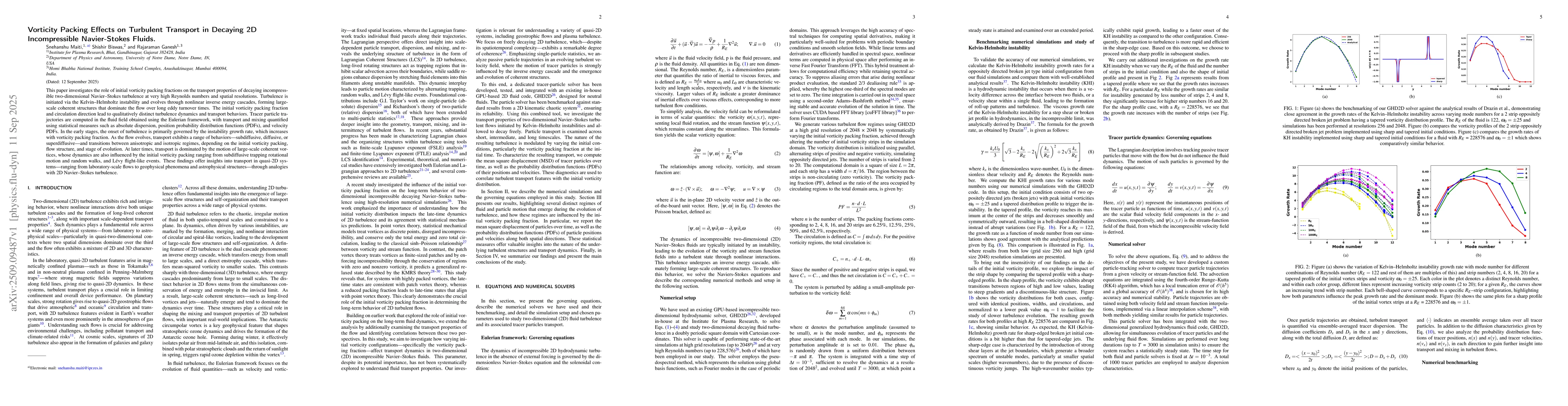 This paper investigates the role of initial vorticity packing fractions on the transport properties of decaying incompressible two-dimensional Navier-Stokes turbulence at very high Reynolds numbers and spatial resolutions. Turbulence is initiated via the Kelvin-Helmholtz instability and evolves through nonlinear inverse energy cascades, forming large-scale coherent structures that dominate the flow over long eddy turnover times. The initial vorticity packing fraction and circulation direction lead to qualitatively distinct turbulence dynamics and transport behaviors. Tracer particle trajectories are computed in the fluid field obtained using the Eulerian framework, with transport and mixing quantified using statistical measures such as absolute dispersion, position probability distribution functions (PDFs), and velocity PDFs. In the early stages, the onset of turbulence is primarily governed by the instability growth rate, which increases with vorticity packing fraction. As the flow evolves, transport exhibits a range of behaviors-subdiffusive, diffusive, or superdiffusive-and transitions between anisotropic and isotropic regimes, depending on the initial vorticity packing, flow structure, and stage of evolution. At later times, transport is dominated by the motion of large-scale coherent vortices, whose dynamics are also influenced by the initial vorticity packing ranging from subdiffusive trapping rotational motion and random walks, and L\'evy flight-like events. These findings offer insights into transport in quasi-2D systems-ranging from laboratory-scale flows to geophysical phenomena and astrophysical structures-through analogies with 2D Navier-Stokes turbulence.