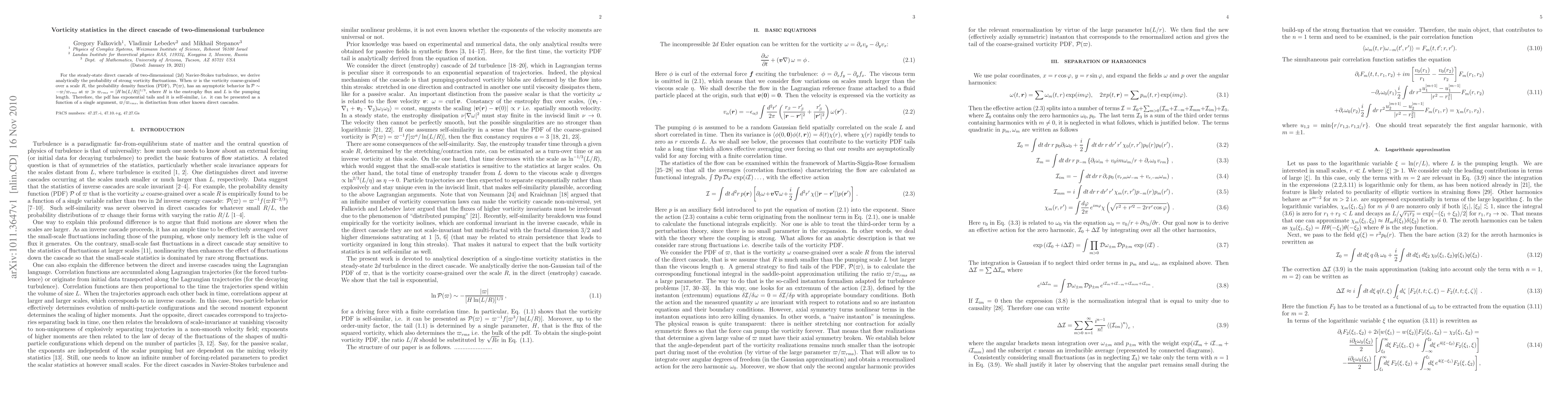 This paper analytically derives the probability density function of vorticity fluctuations in two-dimensional turbulence, revealing a universal self-similar form and exponential tails, distinguishing it from other direct cascades. The study focuses on the steady-state direct cascade of two-dimensional Navier-Stokes turbulence.