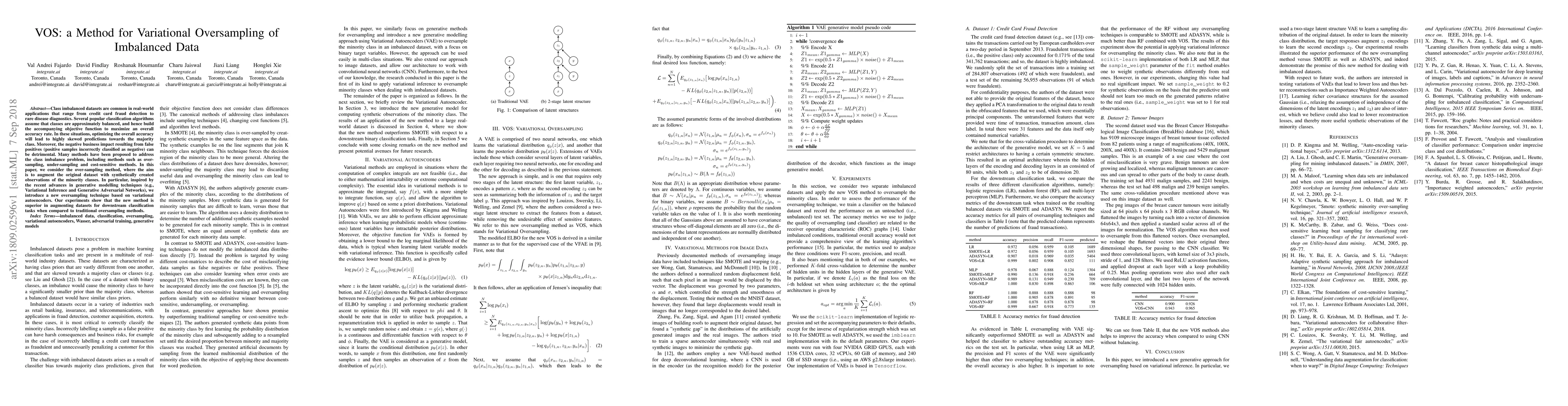 Class imbalanced datasets are common in real-world applications that range from credit card fraud detection to rare disease diagnostics. Several popular classification algorithms assume that classes are approximately balanced, and hence build the accompanying objective function to maximize an overall accuracy rate. In these situations, optimizing the overall accuracy will lead to highly skewed predictions towards the majority class. Moreover, the negative business impact resulting from false positives (positive samples incorrectly classified as negative) can be detrimental. Many methods have been proposed to address the class imbalance problem, including methods such as over-sampling, under-sampling and cost-sensitive methods. In this paper, we consider the over-sampling method, where the aim is to augment the original dataset with synthetically created observations of the minority classes. In particular, inspired by the recent advances in generative modelling techniques (e.g., Variational Inference and Generative Adversarial Networks), we introduce a new oversampling technique based on variational autoencoders. Our experiments show that the new method is superior in augmenting datasets for downstream classification tasks when compared to traditional oversampling methods.