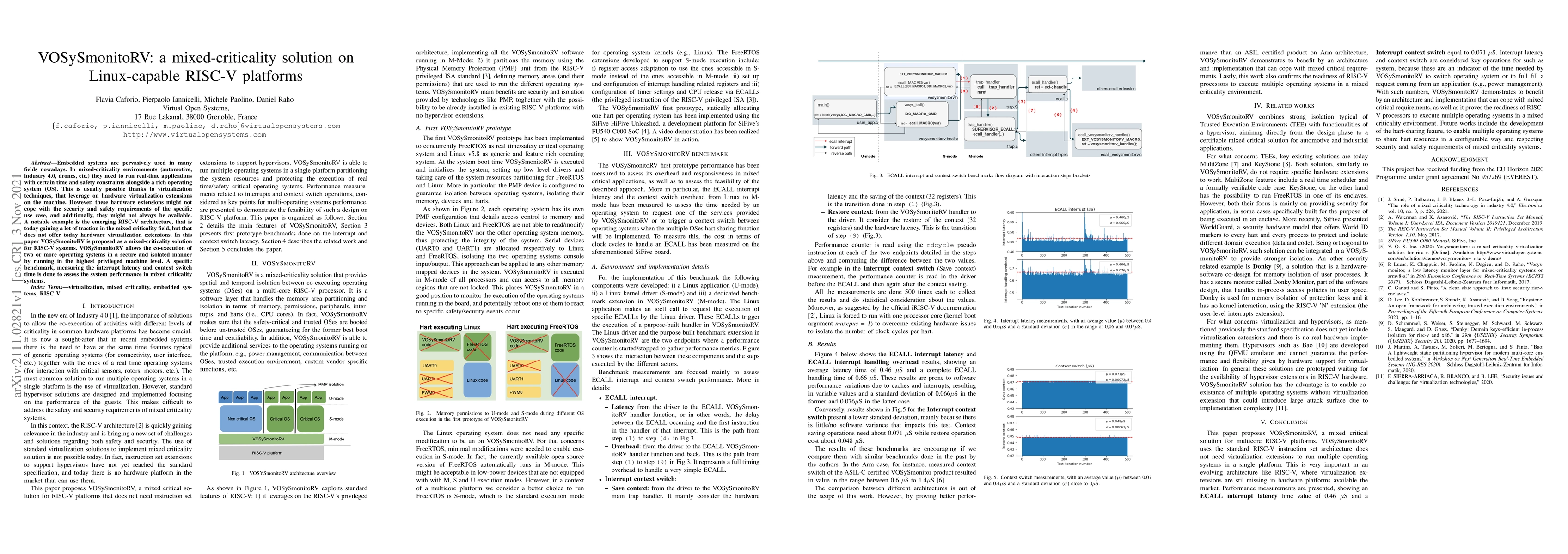 VOSySmonitoRV provides a mixed-criticality solution for RISC-V platforms, enabling the secure and isolated co-execution of multiple operating systems without relying on hardware virtualization extensions. A benchmark evaluates its performance in mixed-criticality environments.