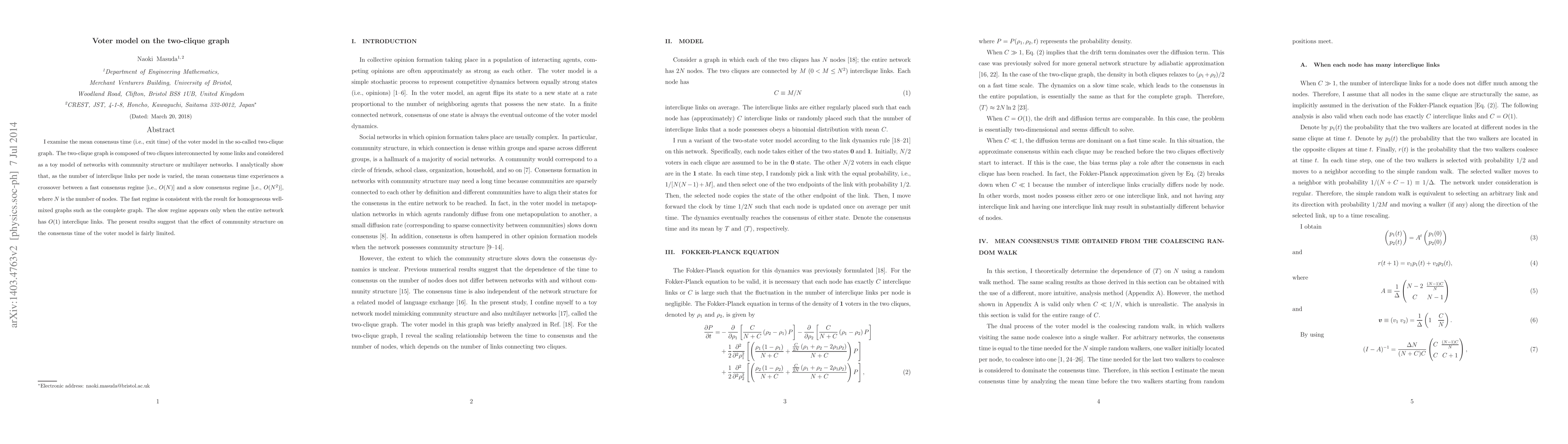 This paper investigates the mean consensus time in the voter model on a two-clique graph, revealing a crossover between fast consensus [O(N)] and slow consensus [O(N^2)] regimes as interclique links vary. The findings suggest that community structure has a limited effect on consensus time.