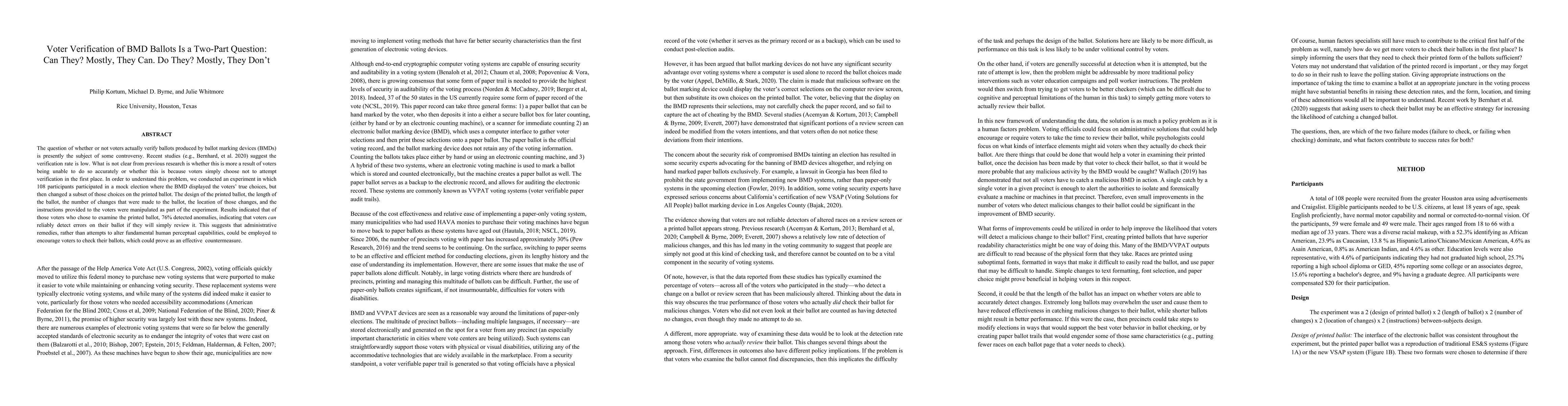 The question of whether or not voters actually verify ballots produced by ballot marking devices (BMDs) is presently the subject of some controversy. Recent studies (e.g., Bernhard, et al. 2020) suggest the verification rate is low. What is not clear from previous research is whether this is more a result of voters being unable to do so accurately or whether this is because voters simply choose not to attempt verification in the first place. In order to understand this problem, we conducted an experiment in which 108 participants participated in a mock election where the BMD displayed the voters' true choices, but then changed a subset of those choices on the printed ballot. The design of the printed ballot, the length of the ballot, the number of changes that were made to the ballot, the location of those changes, and the instructions provided to the voters were manipulated as part of the experiment. Results indicated that of those voters who chose to examine the printed ballot, 76% detected anomalies, indicating that voters can reliably detect errors on their ballot if they will simply review it. This suggests that administrative remedies, rather than attempts to alter fundamental human perceptual capabilities, could be employed to encourage voters to check their ballots, which could prove as an effective countermeasure.