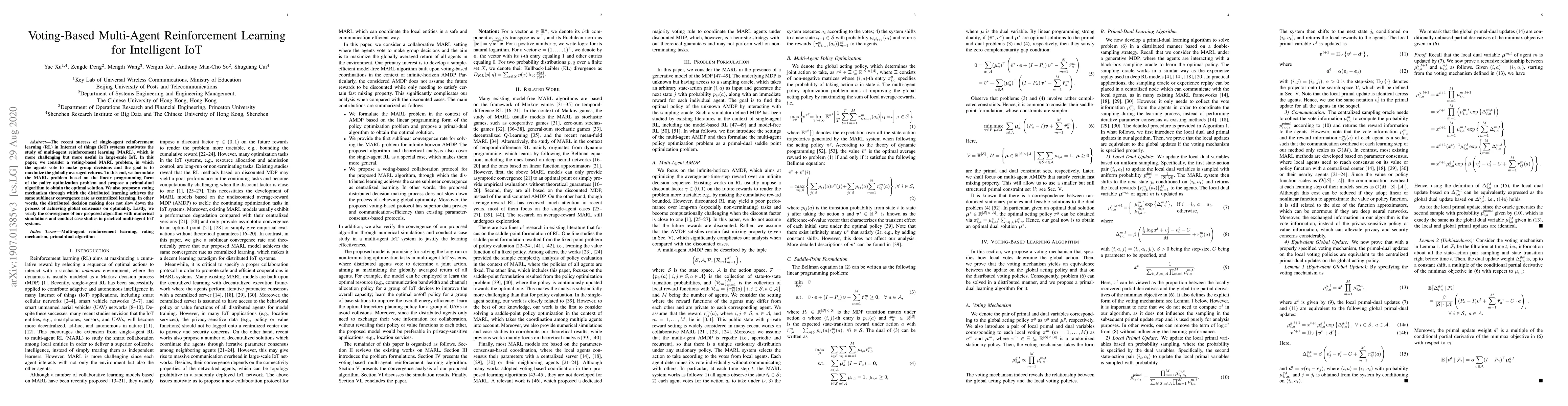 This paper proposes a voting-based multi-agent reinforcement learning (MARL) approach for intelligent IoT systems, aiming to maximize globally averaged returns through group decision-making. The authors introduce a distributed primal-dual algorithm and a voting mechanism to achieve sublinear convergence, ensuring distributed decision-making maintains the same efficiency as centralized learning.