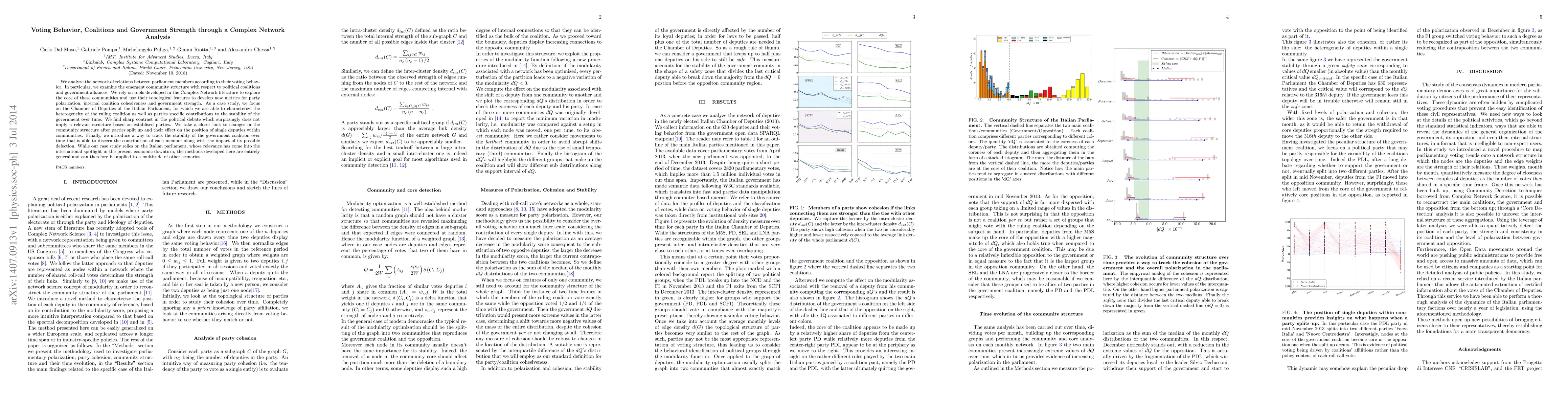 We analyze the network of relations between parliament members according to their voting behavior. In particular, we examine the emergent community structure with respect to political coalitions and government alliances. We rely on tools developed in the Complex Network literature to explore the core of these communities and use their topological features to develop new metrics for party polarization, internal coalition cohesiveness and government strength. As a case study, we focus on the Chamber of Deputies of the Italian Parliament, for which we are able to characterize the heterogeneity of the ruling coalition as well as parties specific contributions to the stability of the government over time. We find sharp contrast in the political debate which surprisingly does not imply a relevant structure based on establised parties. We take a closer look to changes in the community structure after parties split up and their effect on the position of single deputies within communities. Finally, we introduce a way to track the stability of the government coalition over time that is able to discern the contribution of each member along with the impact of its possible defection. While our case study relies on the Italian parliament, whose relevance has come into the international spotlight in the present economic downturn, the methods developed here are entirely general and can therefore be applied to a multitude of other scenarios.