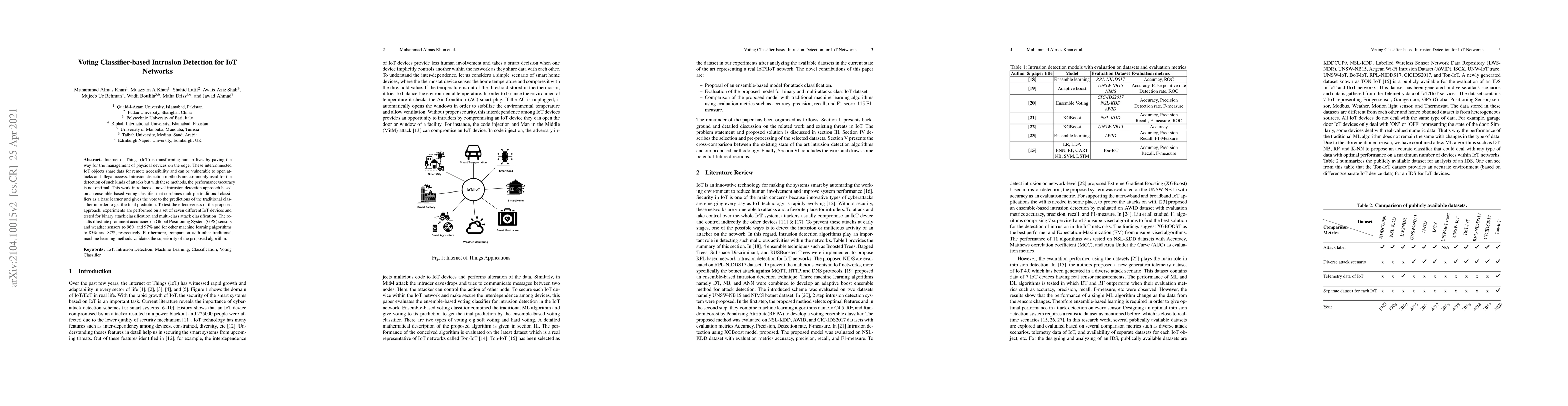 Internet of Things (IoT) is transforming human lives by paving the way for the management of physical devices on the edge. These interconnected IoT objects share data for remote accessibility and can be vulnerable to open attacks and illegal access. Intrusion detection methods are commonly used for the detection of such kinds of attacks but with these methods, the performance/accuracy is not optimal. This work introduces a novel intrusion detection approach based on an ensemble-based voting classifier that combines multiple traditional classifiers as a base learner and gives the vote to the predictions of the traditional classifier in order to get the final prediction. To test the effectiveness of the proposed approach, experiments are performed on a set of seven different IoT devices and tested for binary attack classification and multi-class attack classification. The results illustrate prominent accuracies on Global Positioning System (GPS) sensors and weather sensors to 96% and 97% and for other machine learning algorithms to 85% and 87%, respectively. Furthermore, comparison with other traditional machine learning methods validates the superiority of the proposed algorithm.