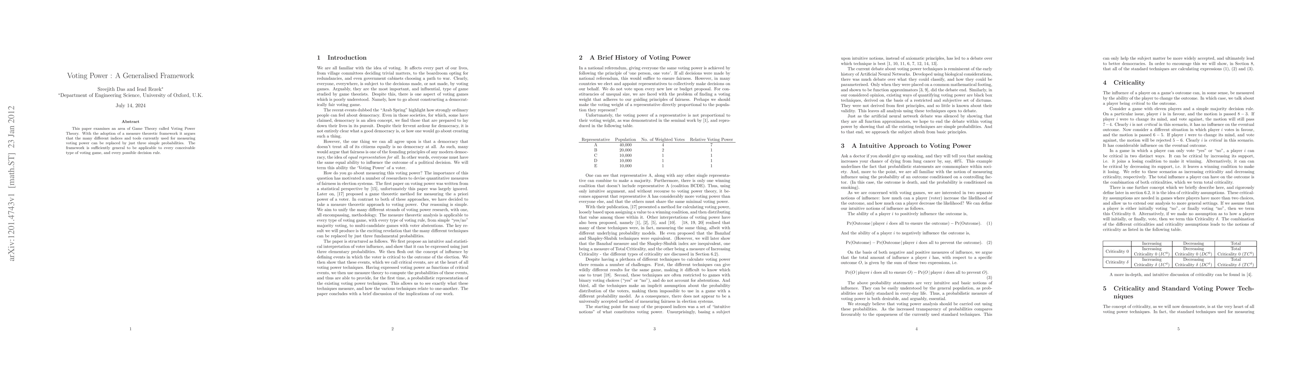 This paper examines an area of Game Theory called Voting Power Theory. With the adoption of a measure theoretic framework it argues that the many different indices and tools currently used for measuring voting power can be replaced by just three simple probabilities. The framework is sufficiently general to be applicable to every conceivable type of voting game, and every possible decision rule.