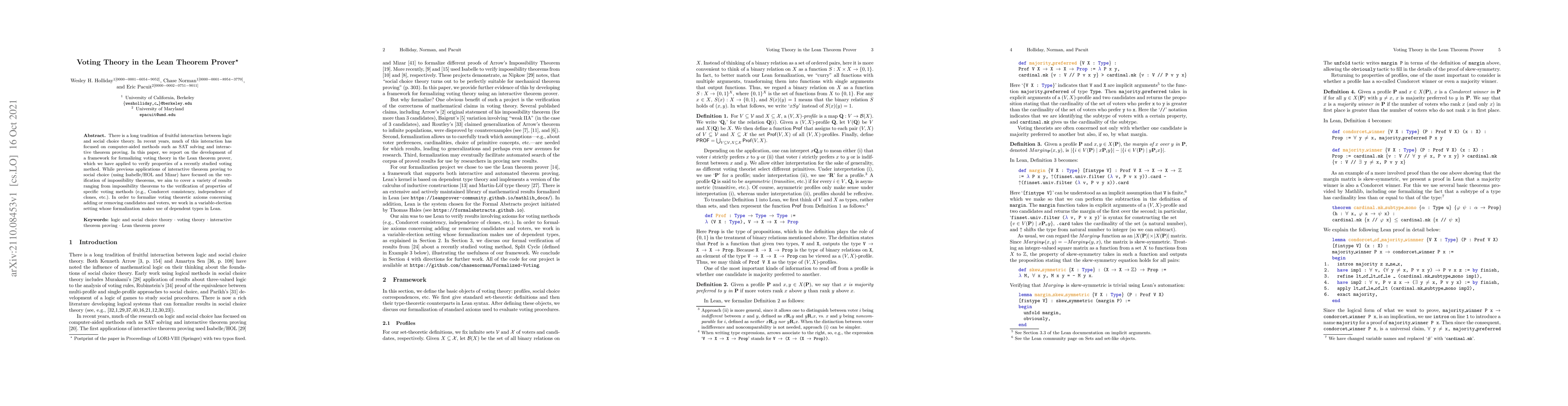 This paper develops a framework for formalizing voting theory in the Lean theorem prover to verify properties of various voting methods, including impossibility theorems and specific method characteristics like Condorcet consistency. The authors utilize dependent types to handle dynamic election settings with variable candidates and voters.