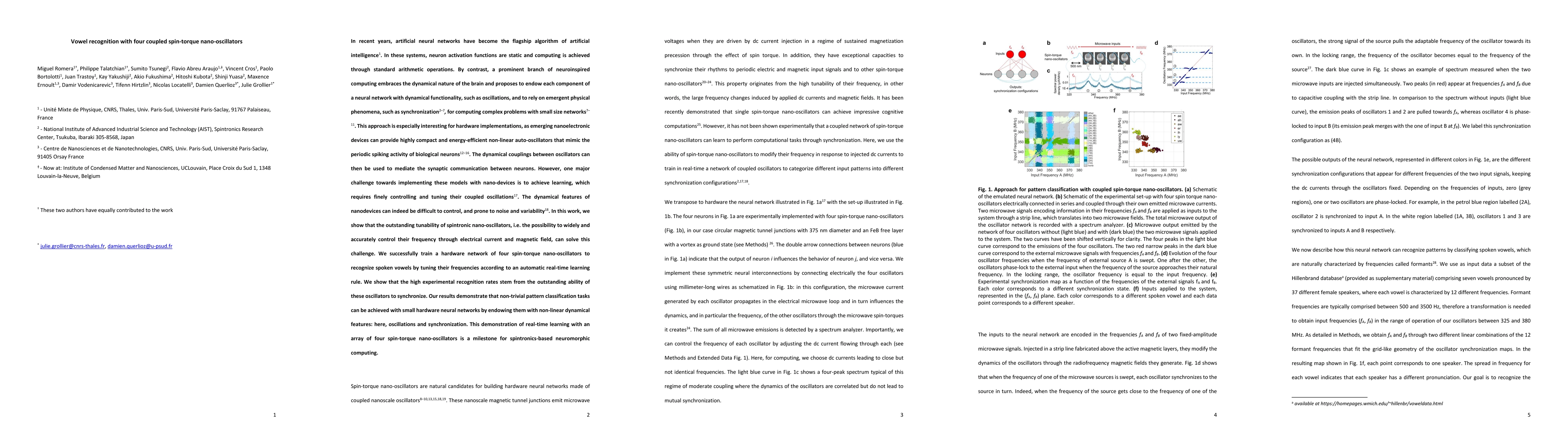 The paper presents a novel approach to vowel recognition using a hardware network of coupled spin-torque nano-oscillators, demonstrating the potential of spintronic devices for neuromorphic computing.