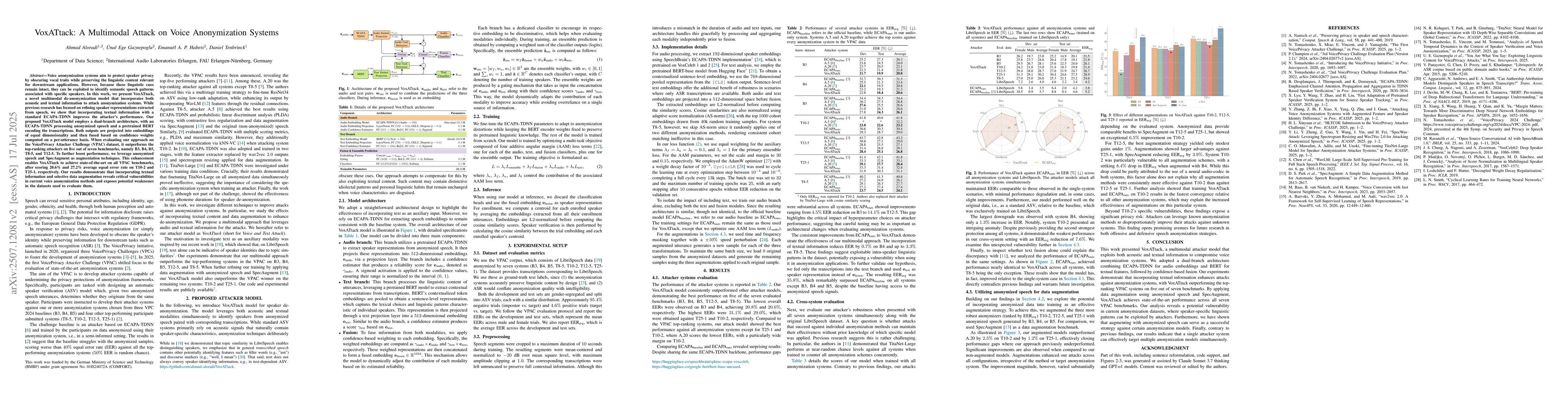 Voice anonymization systems aim to protect speaker privacy by obscuring vocal traits while preserving the linguistic content relevant for downstream applications. However, because these linguistic cues remain intact, they can be exploited to identify semantic speech patterns associated with specific speakers. In this work, we present VoxATtack, a novel multimodal de-anonymization model that incorporates both acoustic and textual information to attack anonymization systems. While previous research has focused on refining speaker representations extracted from speech, we show that incorporating textual information with a standard ECAPA-TDNN improves the attacker's performance. Our proposed VoxATtack model employs a dual-branch architecture, with an ECAPA-TDNN processing anonymized speech and a pretrained BERT encoding the transcriptions. Both outputs are projected into embeddings of equal dimensionality and then fused based on confidence weights computed on a per-utterance basis. When evaluating our approach on the VoicePrivacy Attacker Challenge (VPAC) dataset, it outperforms the top-ranking attackers on five out of seven benchmarks, namely B3, B4, B5, T8-5, and T12-5. To further boost performance, we leverage anonymized speech and SpecAugment as augmentation techniques. This enhancement enables VoxATtack to achieve state-of-the-art on all VPAC benchmarks, after scoring 20.6% and 27.2% average equal error rate on T10-2 and T25-1, respectively. Our results demonstrate that incorporating textual information and selective data augmentation reveals critical vulnerabilities in current voice anonymization methods and exposes potential weaknesses in the datasets used to evaluate them.