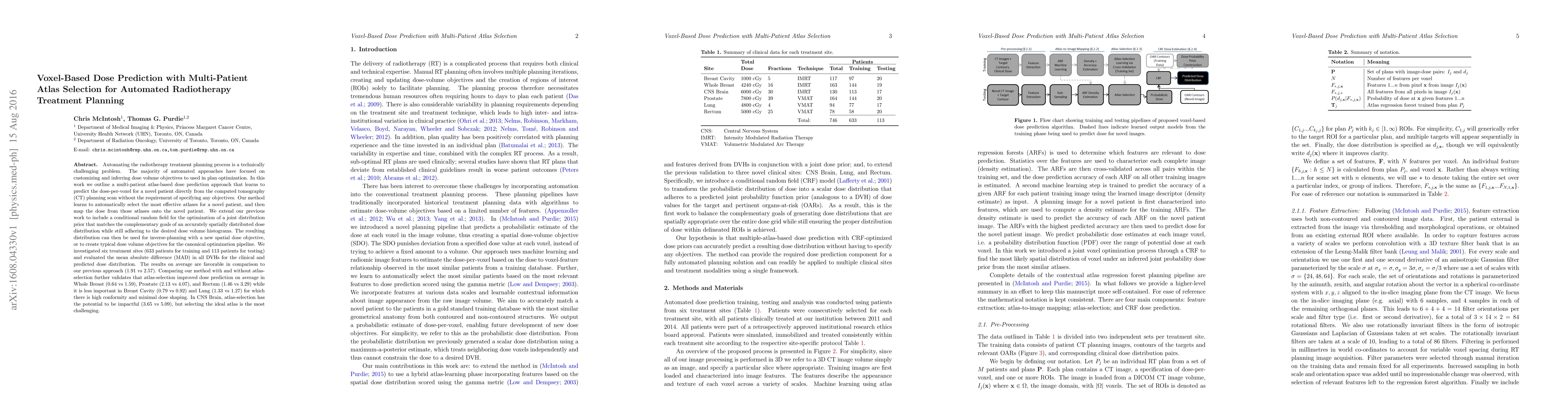 This paper proposes a multi-patient atlas-based method for automated radiotherapy treatment planning that predicts dose per voxel directly from CT scans without predefined objectives. The method improves dose prediction accuracy through atlas selection, showing significant improvements in dose volume histograms across various treatment sites.
