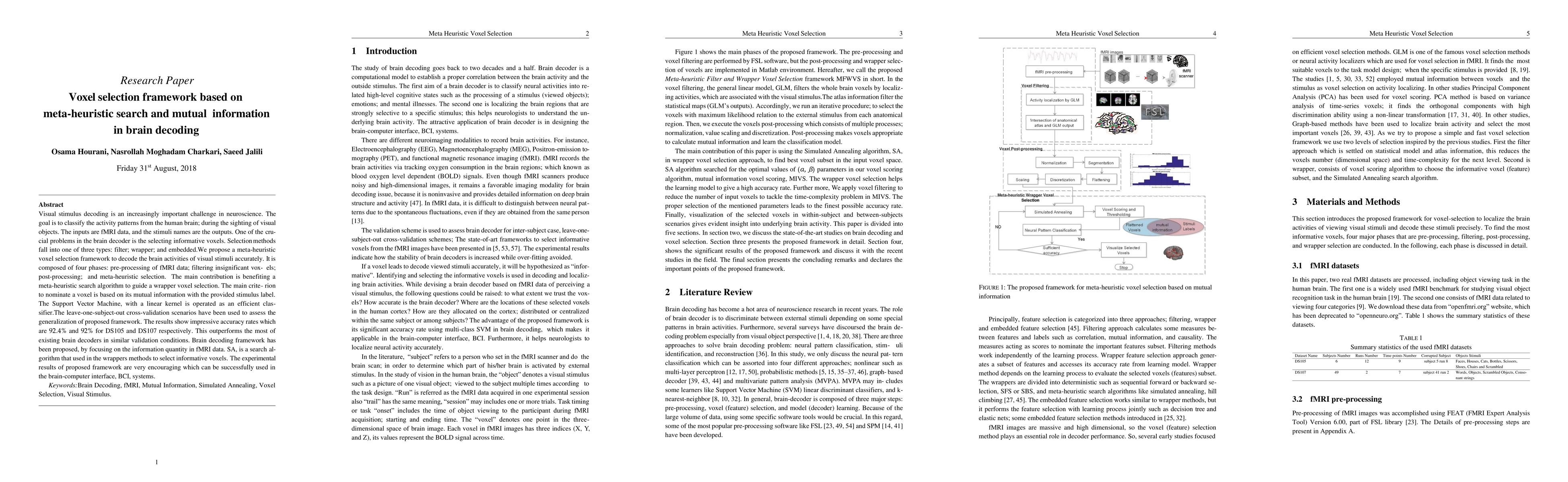 This paper proposes a meta-heuristic search framework for selecting informative voxels in brain decoding, achieving high accuracy rates of 90.66% and 91.61% for two datasets. The framework uses mutual information as the main criterion for voxel selection, outperforming existing brain decoders.