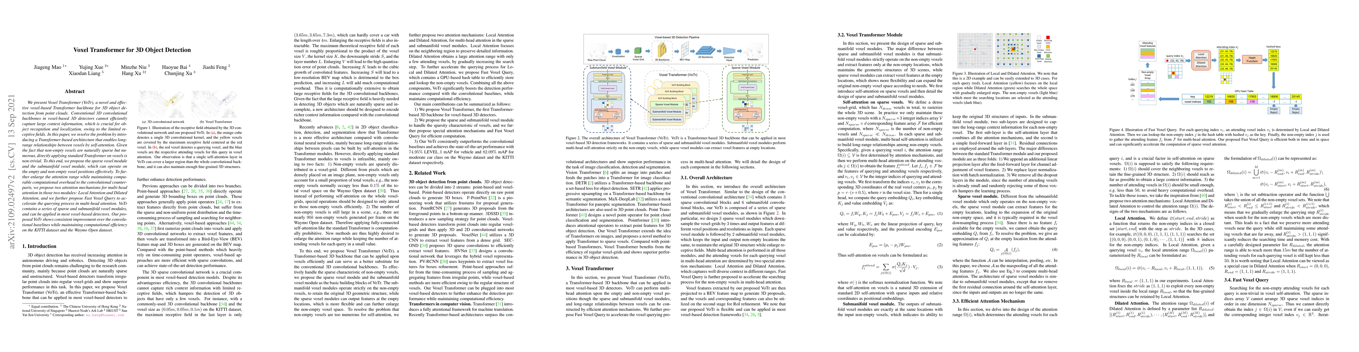 The Voxel Transformer (VoTr) introduces a novel Transformer-based architecture for 3D object detection from point clouds, addressing the limitations of conventional 3D convolutional backbones in capturing large context information. VoTr employs sparse and submanifold voxel modules to efficiently handle sparse voxel data and utilizes Local and Dilated Attention mechanisms to enhance long-range relationships.