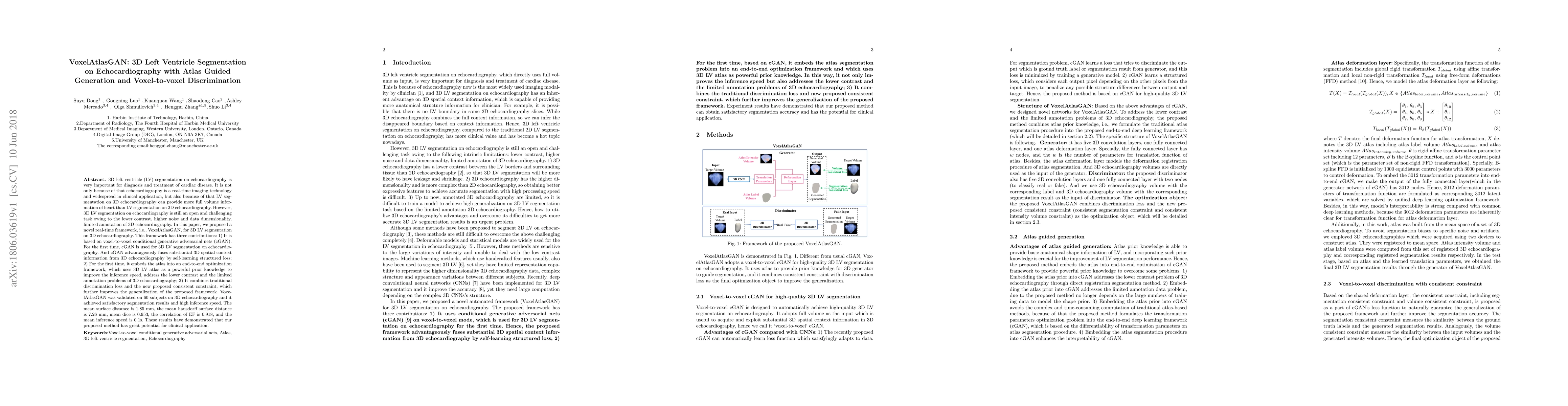 VoxelAtlasGAN introduces a novel framework for real-time 3D left ventricle segmentation on echocardiography, leveraging voxel-to-voxel conditional GANs, atlas-guided generation, and voxel discrimination to achieve high accuracy and speed, validated with promising metrics on clinical data.