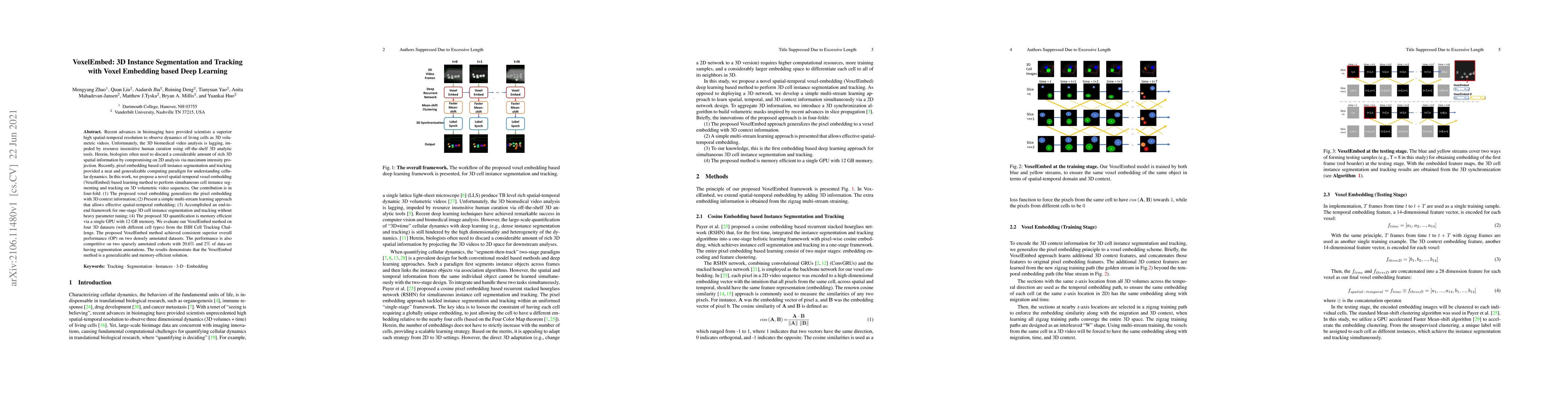 The VoxelEmbed method proposes a novel deep learning approach for 3D instance segmentation and tracking of cells in volumetric video sequences, utilizing voxel embeddings to incorporate 3D context information. The method demonstrates superior performance on densely annotated datasets and competitive results on sparsely annotated ones, showcasing its generalizability and memory efficiency.
