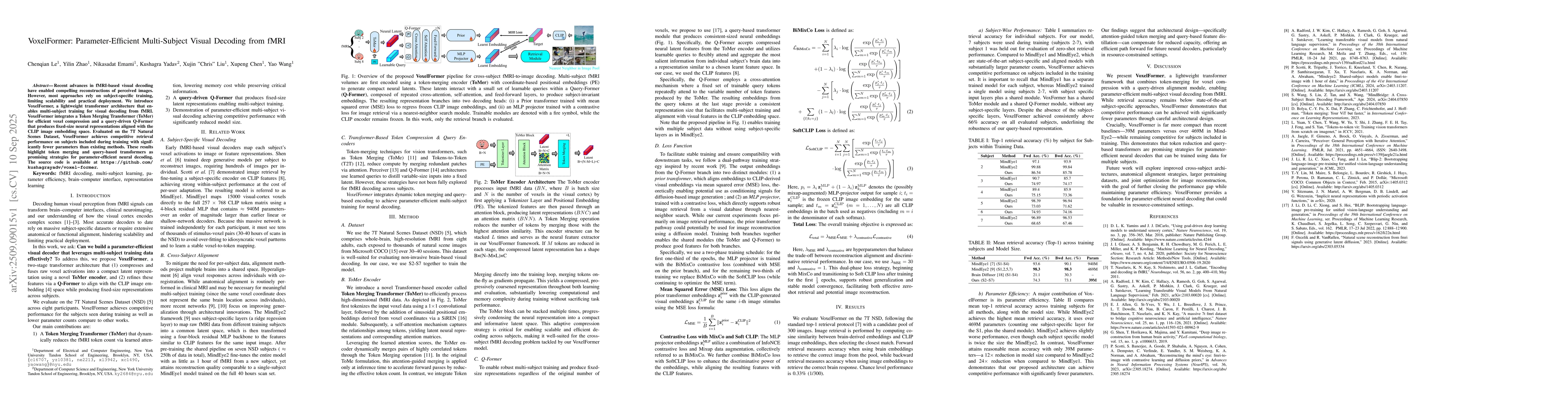 Recent advances in fMRI-based visual decoding have enabled compelling reconstructions of perceived images. However, most approaches rely on subject-specific training, limiting scalability and practical deployment. We introduce \textbf{VoxelFormer}, a lightweight transformer architecture that enables multi-subject training for visual decoding from fMRI. VoxelFormer integrates a Token Merging Transformer (ToMer) for efficient voxel compression and a query-driven Q-Former that produces fixed-size neural representations aligned with the CLIP image embedding space. Evaluated on the 7T Natural Scenes Dataset, VoxelFormer achieves competitive retrieval performance on subjects included during training with significantly fewer parameters than existing methods. These results highlight token merging and query-based transformers as promising strategies for parameter-efficient neural decoding.