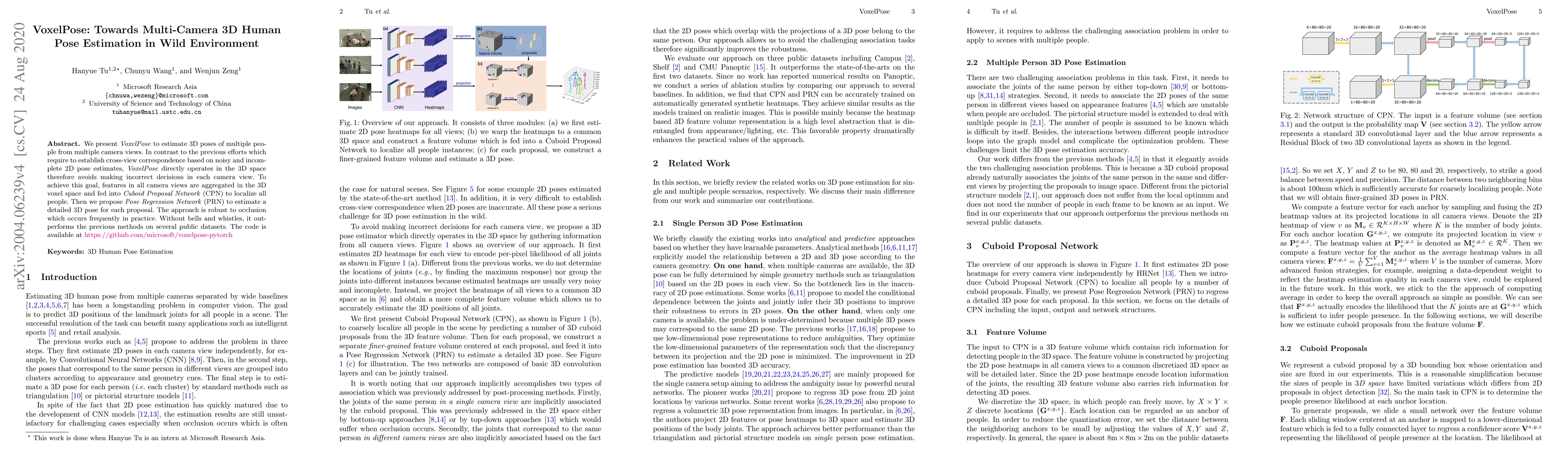 The paper introduces VoxelPose, an end-to-end approach for estimating 3D poses of multiple people across multiple camera views, bypassing 2D intermediate steps. It utilizes a Cuboid Proposal Network (CPN) for coarse localization in 3D space and a Pose Regression Network (PRN) for detailed 3D pose estimation, demonstrating robustness to occlusion and outperforming existing methods on public datasets.