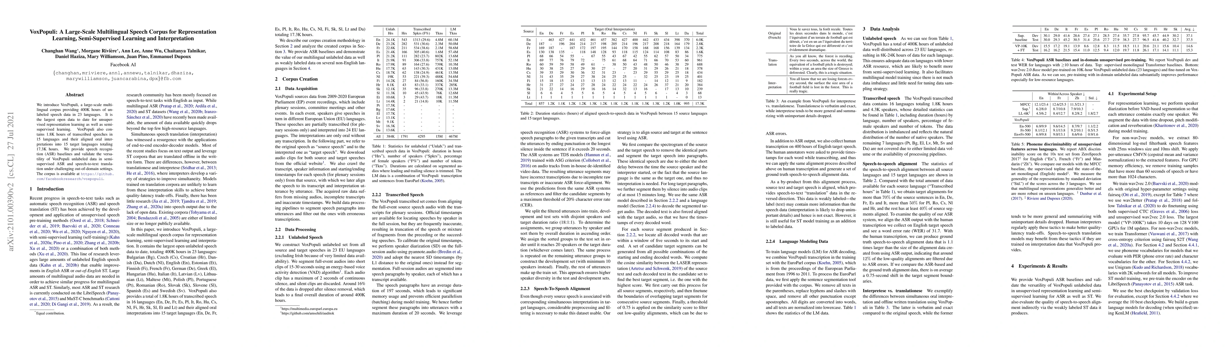 VoxPopuli is a vast multilingual speech corpus featuring 100K hours of unlabelled speech and 5.1K hours of transcribed speeches with aligned oral interpretations across 28 languages. It serves as a resource for unsupervised and semi-supervised learning, with an open release available for research.