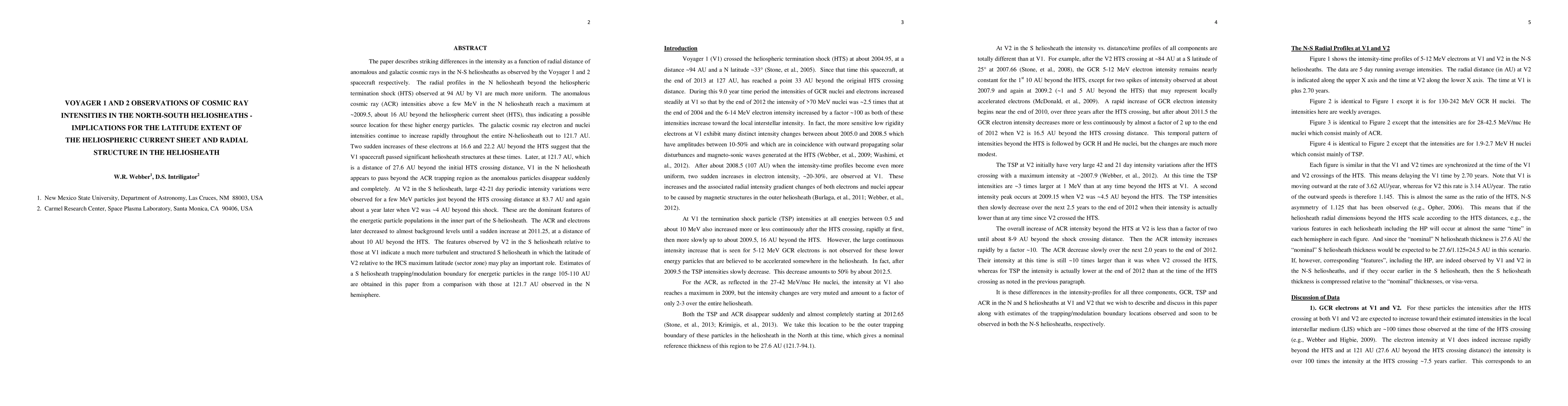 The paper describes differences in the intensity as a function of radial distance of anomalous and galactic cosmic rays in the N-S heliosheaths as observed by the Voyager 1 and 2 spacecraft respectively. The anomalous cosmic ray (ACR) intensities above a few MeV in the N heliosheath reach a maximum at ~2009.5, about 16 AU beyond the heliospheric current sheet (HTS), thus indicating a possible source location for these higher energy particles. The galactic cosmic ray electron and nuclei intensities continue to increase rapidly throughout the entire N-heliosheath out to 121.7 AU. Two sudden increases of these electrons at 16.6 and 22.2 AU beyond the HTS suggest that the V1 spacecraft passed significant heliosheath structures at these times. Later, at 121.7 AU, which is a distance of 27.6 AU beyond the initial HTS crossing distance, V1 in the N heliosheath appears to pass beyond the ACR trapping region as the anomalous particles disappear suddenly and completely. At V2 in the S heliosheath, large 42-21 day periodic intensity variations were observed for a few MeV particles just beyond the HTS crossing distance at 83.7 AU and again about a year later when V2 was ~4 AU beyond this shock. These are the dominant features of the energetic particle populations in the inner part of the S-heliosheath. The ACR and electrons later decreased to almost background levels until a sudden increase at 2011.25, at a distance of about 10 AU beyond the HTS. The features observed by V2 in the S heliosheath relative to those at V1 indicate a much more structured S heliosheath in which the latitude of V2 relative to the HCS maximum latitude (sector zone) may play an important role. Estimates of a S heliosheath trapping/modulation boundary for energetic particles in the range 105-110 AU are obtained in this paper from a comparison with those at 121.7 AU observed in the N hemisphere.