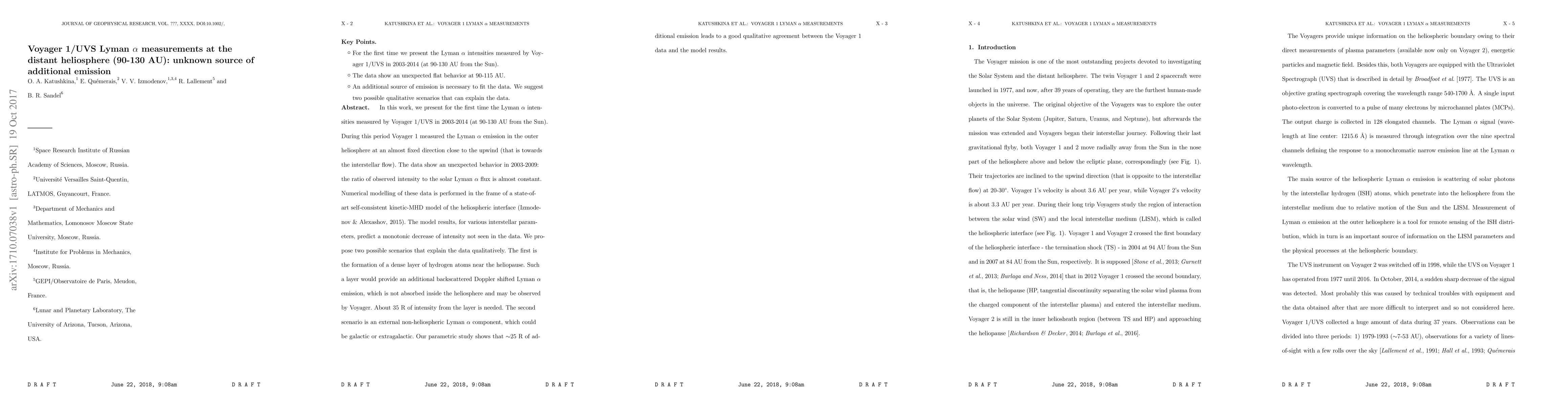 This paper reports unexpected Lyman $\alpha$ emission measurements by Voyager 1 at 90-130 AU, showing a constant ratio to solar flux despite predictions of a monotonic decrease. Two potential explanations are proposed: a dense hydrogen layer near the heliopause creating backscattered emission, or an external non-heliospheric Lyman $\alpha$ component, possibly galactic or extragalactic.