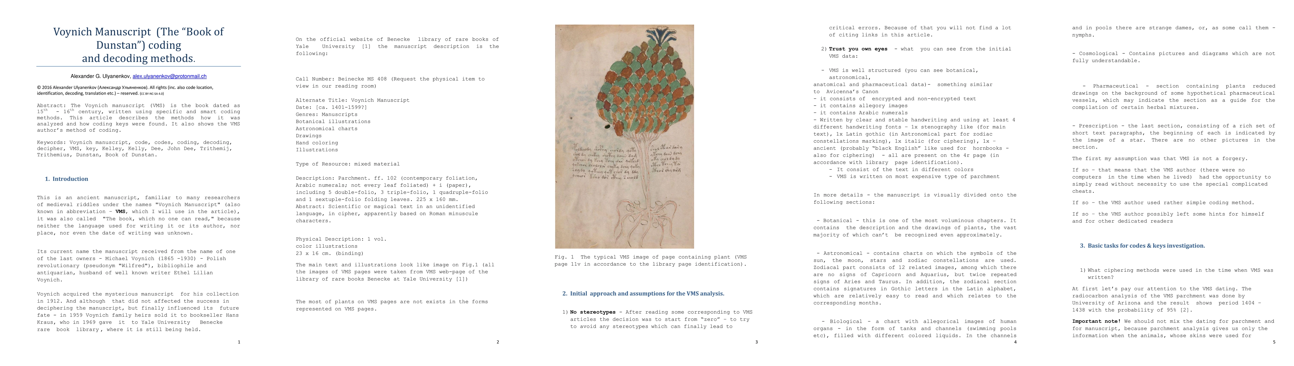 The Voynich manuscript is the book initially dated as fifteenth century book. It written using specific and smart coding methods. This article describes the methods how it was analyzed and how coding keys were found. The last manuscript page decoding. Correlation of the last VMS page content with John Dee notes dedicated to 12th of December 1587. The proof that the Voynich manuscript and the "Book of Dunstan" - the same manuscripts. This article contains Engish version(pages 1-86) and equal Russian (pages 87 - 192) version. The new chapter (#13) is dedicated to Christian symbolics in VMS as well as for the solution of the riddle of 3 queens in astrological part and the riddle of diagram with 2 cancers (red and white) as additional proof of John Dee authorship of manuscript.