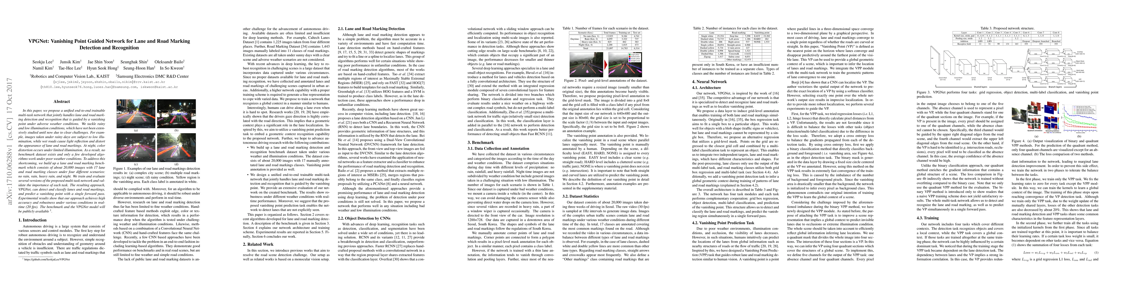 VPGNet is a unified end-to-end trainable network for detecting and recognizing lane and road markings under adverse weather conditions, including rainy and low illumination scenarios. The model predicts a vanishing point and achieves high accuracy and robustness in real-time, with a new benchmark dataset of 20,000 images under various weather conditions.