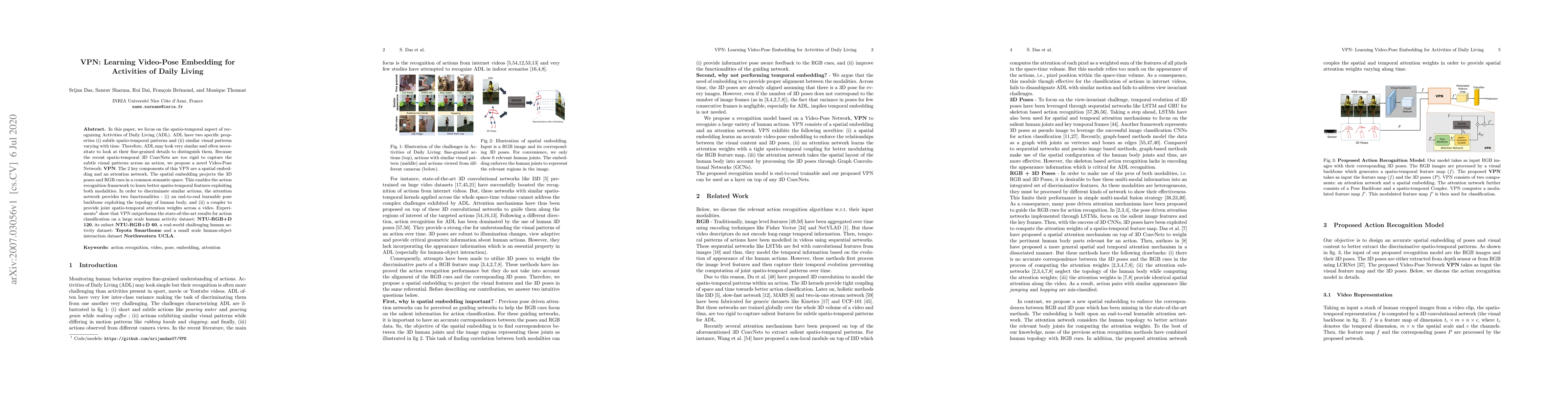 This paper proposes a Video-Pose Network (VPN) to recognize Activities of Daily Living (ADL) by combining spatial embedding and an attention network to capture subtle spatio-temporal patterns. The VPN outperforms existing methods on several datasets, demonstrating its effectiveness in distinguishing similar actions.