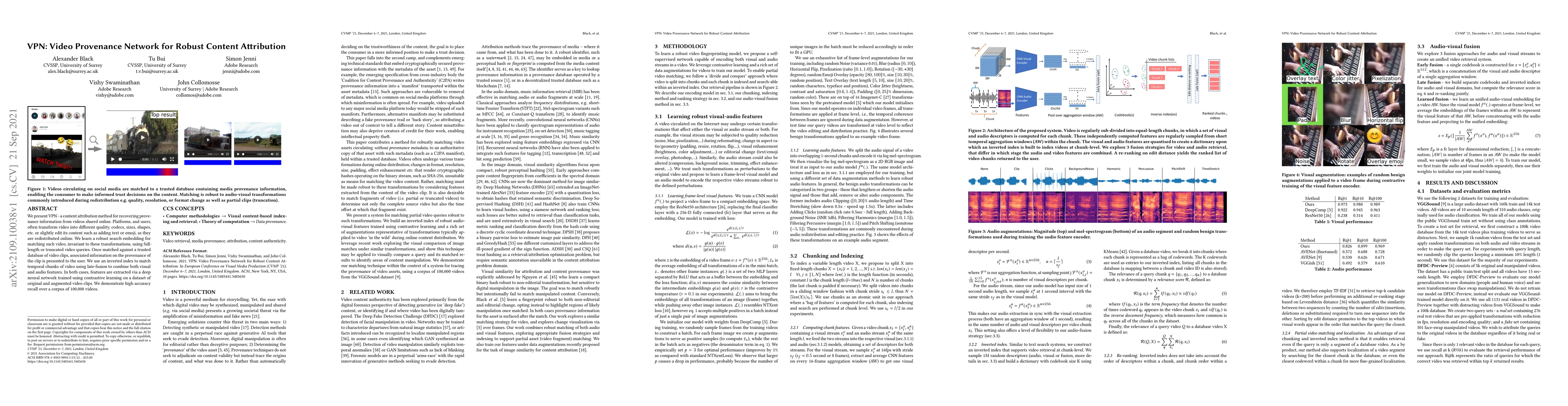 The VPN method provides a robust content attribution technique for videos shared online by learning a search embedding that matches transformed or edited video clips, using deep neural networks and contrastive learning. It achieves high accuracy in provenance recovery through an inverted index and late-fusion of visual and audio features.