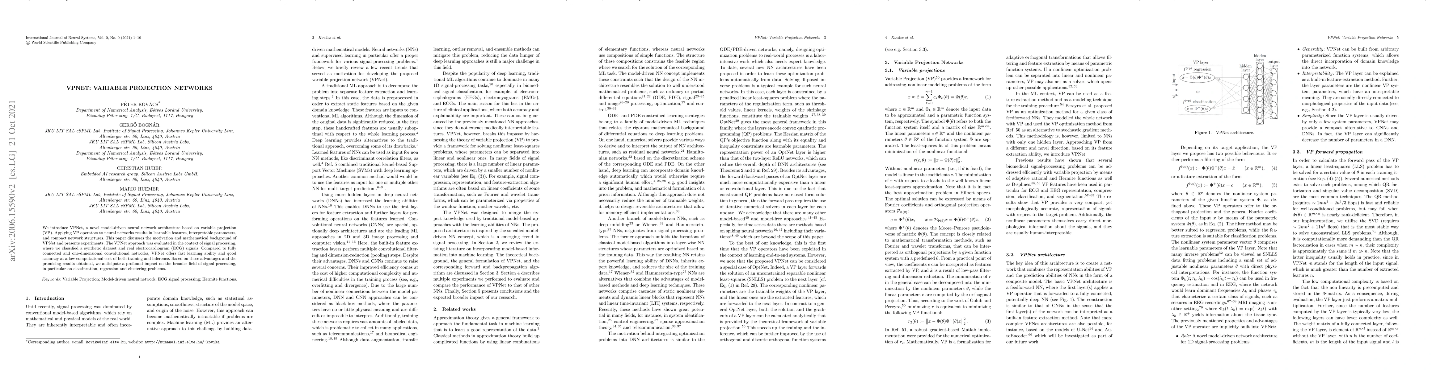 We introduce VPNet, a novel model-driven neural network architecture based on variable projection (VP). Applying VP operators to neural networks results in learnable features, interpretable parameters, and compact network structures. This paper discusses the motivation and mathematical background of VPNet and presents experiments. The VPNet approach was evaluated in the context of signal processing, where we classified a synthetic dataset and real electrocardiogram (ECG) signals. Compared to fully connected and one-dimensional convolutional networks, VPNet offers fast learning ability and good accuracy at a low computational cost of both training and inference. Based on these advantages and the promising results obtained, we anticipate a profound impact on the broader field of signal processing, in particular on classification, regression and clustering problems.