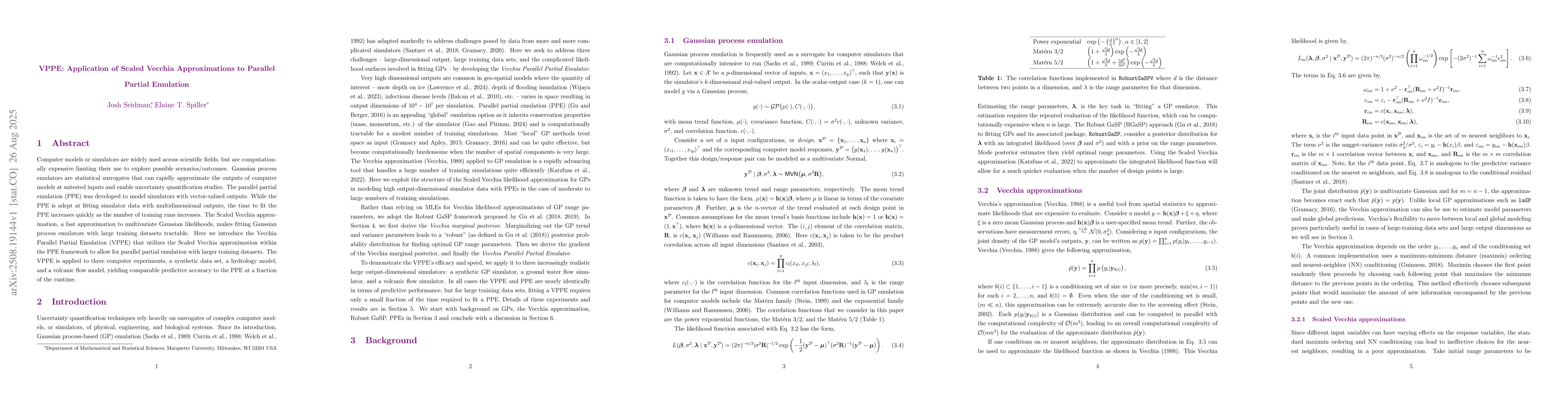 Computer models or simulators are widely used across scientific fields, but are computationally expensive limiting their use to explore possible scenarios/outcomes. Gaussian process emulators are statistical surrogates that can rapidly approximate the outputs of computer models at untested inputs and enable uncertainty quantification studies. The parallel partial emulation (PPE) was developed to model simulators with vector-valued outputs. While the PPE is adept at fitting simulator data with multidimensional outputs, the time to fit the PPE increases quickly as the number of training runs increases. The Scaled Vecchia approximation, a fast approximation to multivariate Gaussian likelihoods, makes fitting Gaussian process emulators with large training datasets tractable. Here we introduce the Vecchia Parallel Partial Emulation (VPPE) that utilizes the Scaled Vecchia approximation within the PPE framework to allow for parallel partial emulation with larger training datasets. The VPPE is applied to three computer experiments, a synthetic data set, a hydrology model, and a volcanic flow model, yielding comparable predictive accuracy to the PPE at a fraction of the runtime.
