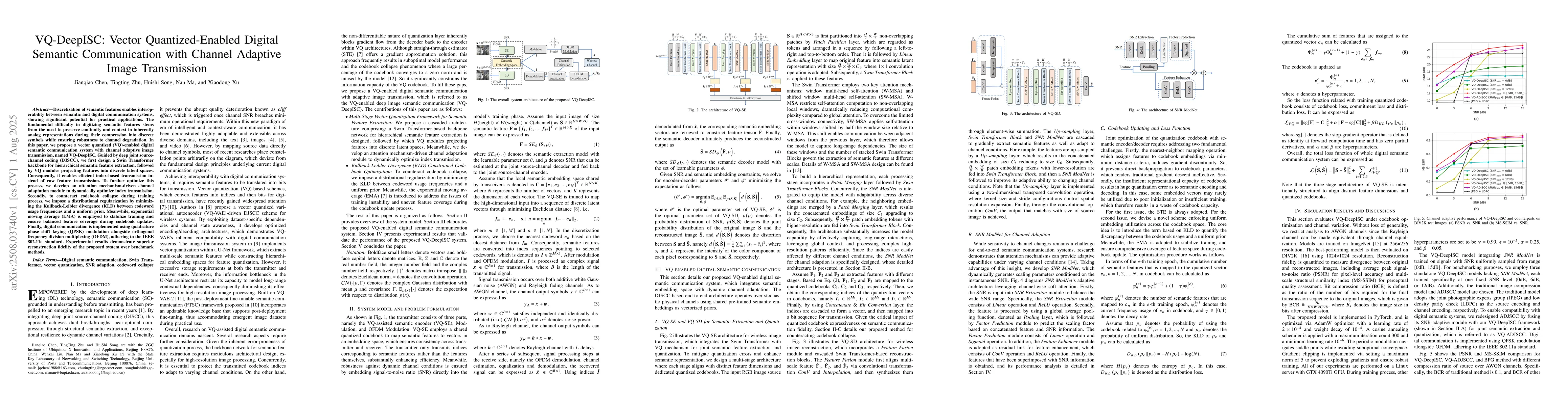 Discretization of semantic features enables interoperability between semantic and digital communication systems, showing significant potential for practical applications. The fundamental difficulty in digitizing semantic features stems from the need to preserve continuity and context in inherently analog representations during their compression into discrete symbols while ensuring robustness to channel degradation. In this paper, we propose a vector quantized (VQ)-enabled digital semantic communication system with channel adaptive image transmission, named VQ-DeepISC. Guided by deep joint source-channel coding (DJSCC), we first design a Swin Transformer backbone for hierarchical semantic feature extraction, followed by VQ modules projecting features into discrete latent spaces. Consequently, it enables efficient index-based transmission instead of raw feature transmission. To further optimize this process, we develop an attention mechanism-driven channel adaptation module to dynamically optimize index transmission. Secondly, to counteract codebook collapse during training process, we impose a distributional regularization by minimizing the Kullback-Leibler divergence (KLD) between codeword usage frequencies and a uniform prior. Meanwhile, exponential moving average (EMA) is employed to stabilize training and ensure balanced feature coverage during codebook updates. Finally, digital communication is implemented using quadrature phase shift keying (QPSK) modulation alongside orthogonal frequency division multiplexing (OFDM), adhering to the IEEE 802.11a standard. Experimental results demonstrate superior reconstruction fidelity of the proposed system over benchmark methods.