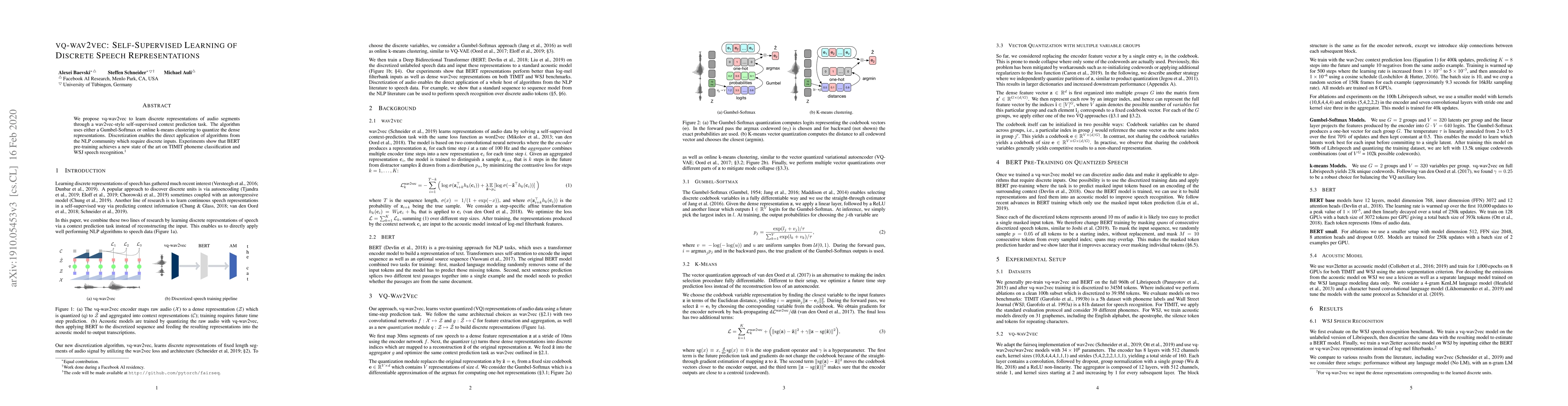 Here's a concise summary of the research paper: This paper introduces vq-wav2vec, a self-supervised learning method for creating discrete speech representations using a context prediction task. The approach quantizes dense representations, enabling the use of NLP algorithms, and demonstrates improved performance on phoneme classification and speech recognition tasks.