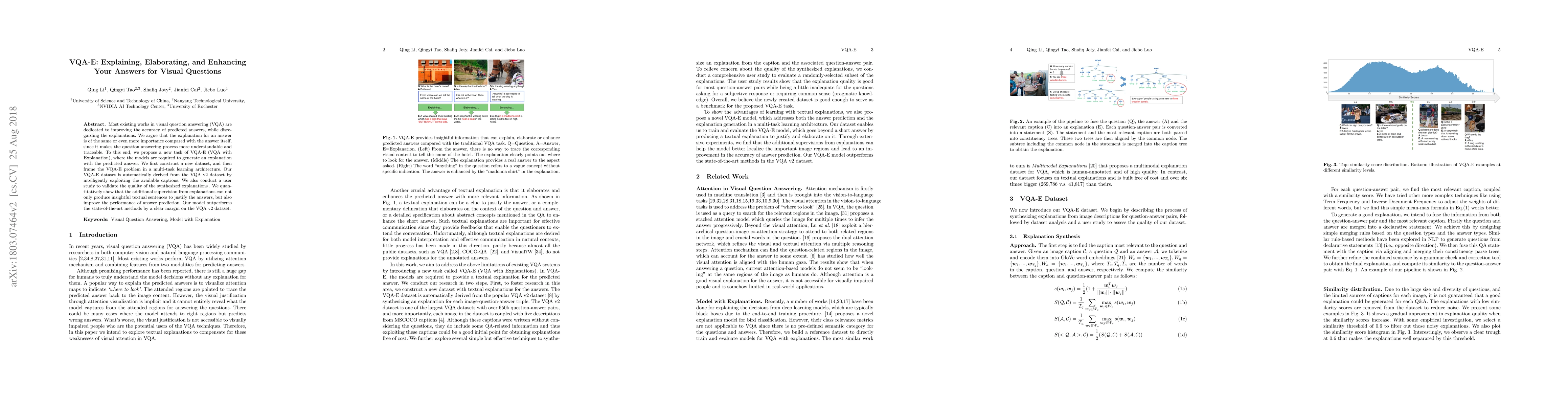 This paper introduces VQA-E, a new task in visual question answering that requires models to generate explanations alongside answers, arguing that explanations are as important as answers for understanding and traceability. The authors propose a multi-task learning framework and a new dataset derived from VQA v2, showing improved answer prediction performance and higher-quality explanations through user study validation.