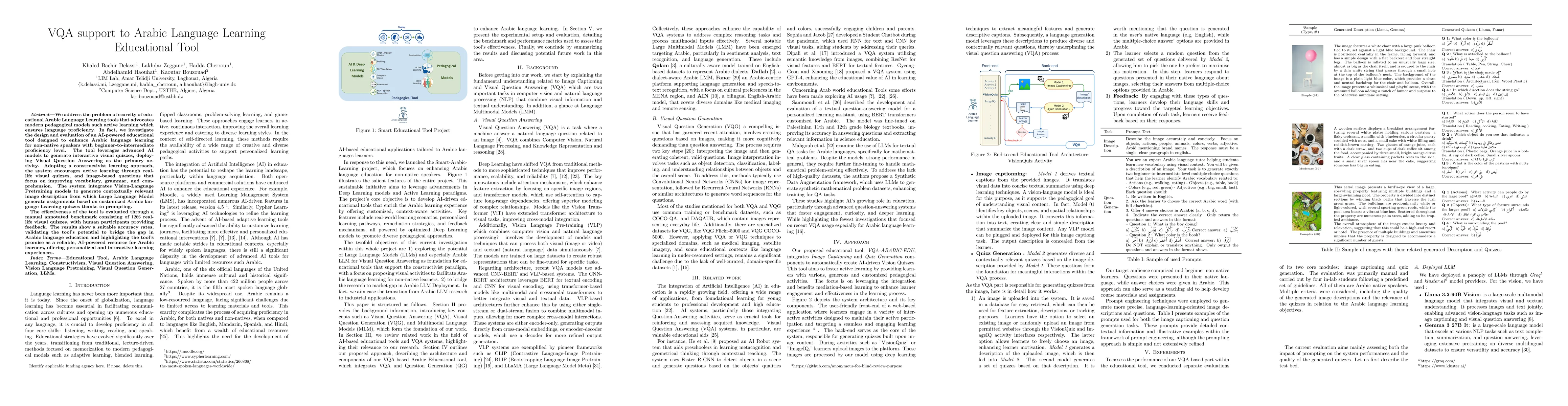 We address the problem of scarcity of educational Arabic Language Learning tools that advocate modern pedagogical models such as active learning which ensures language proficiency. In fact, we investigate the design and evaluation of an AI-powered educational tool designed to enhance Arabic language learning for non-native speakers with beginner-to-intermediate proficiency level. The tool leverages advanced AI models to generate interactive visual quizzes, deploying Visual Question Answering as the primary activity. Adopting a constructivist learning approach, the system encourages active learning through real-life visual quizzes, and image-based questions that focus on improving vocabulary, grammar, and comprehension. The system integrates Vision-Language Pretraining models to generate contextually relevant image description from which Large Language Model generate assignments based on customized Arabic language Learning quizzes thanks to prompting. The effectiveness of the tool is evaluated through a manual annotated benchmark consisting of 1266 real-life visual quizzes, with human participants providing feedback. The results show a suitable accuracy rates, validating the tool's potential to bridge the gap in Arabic language education and highlighting the tool's promise as a reliable, AI-powered resource for Arabic learners, offering personalized and interactive learning experiences.