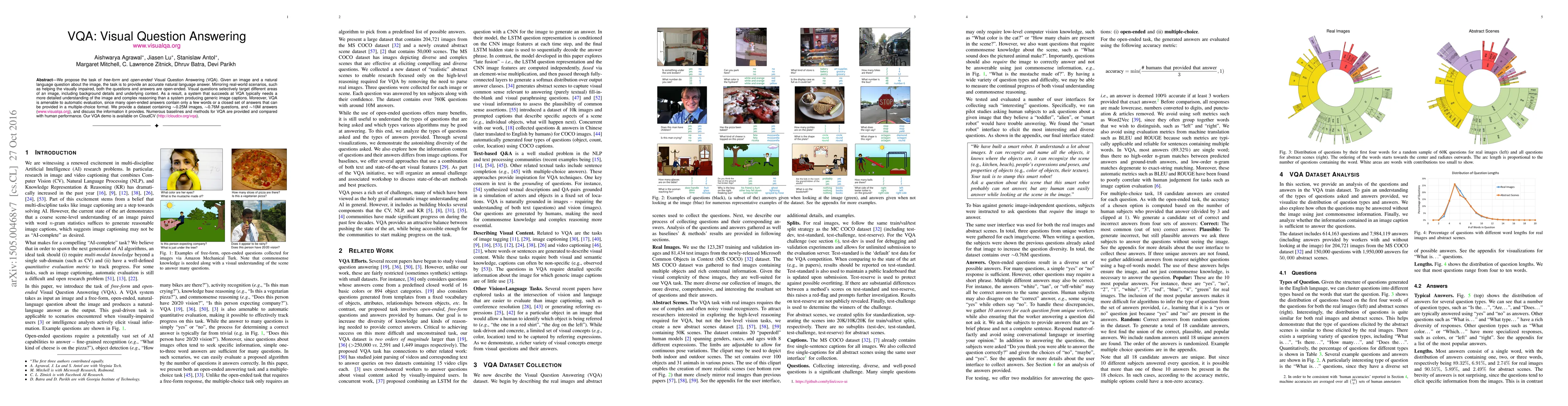 The paper introduces the Visual Question Answering (VQA) task, where the aim is to provide natural language answers to open-ended questions about images, requiring a deeper image understanding and complex reasoning. The authors present a dataset with ~0.25M images, ~0.76M questions, and ~10M answers, and compare various VQA baselines against human performance.