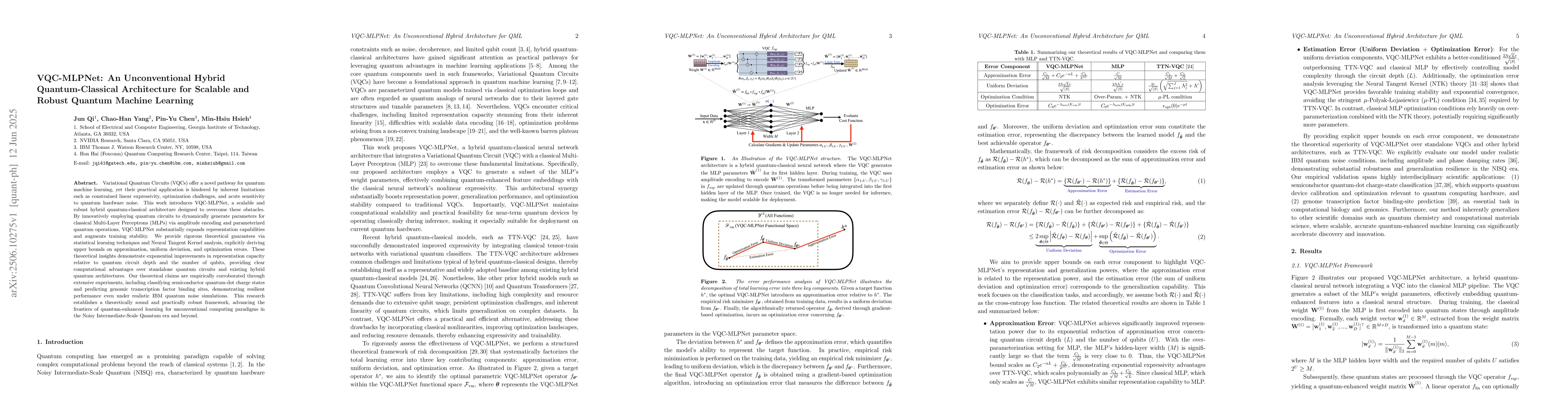 Variational Quantum Circuits (VQCs) offer a novel pathway for quantum machine learning, yet their practical application is hindered by inherent limitations such as constrained linear expressivity, optimization challenges, and acute sensitivity to quantum hardware noise. This work introduces VQC-MLPNet, a scalable and robust hybrid quantum-classical architecture designed to overcome these obstacles. By innovatively employing quantum circuits to dynamically generate parameters for classical Multi-Layer Perceptrons (MLPs) via amplitude encoding and parameterized quantum operations, VQC-MLPNet substantially expands representation capabilities and augments training stability. We provide rigorous theoretical guarantees via statistical learning techniques and Neural Tangent Kernel analysis, explicitly deriving upper bounds on approximation, uniform deviation, and optimization errors. These theoretical insights demonstrate exponential improvements in representation capacity relative to quantum circuit depth and the number of qubits, providing clear computational advantages over standalone quantum circuits and existing hybrid quantum architectures. Our theoretical claims are empirically corroborated through extensive experiments, including classifying semiconductor quantum-dot charge states and predicting genomic transcription factor binding sites, demonstrating resilient performance even under realistic IBM quantum noise simulations. This research establishes a theoretically sound and practically robust framework, advancing the frontiers of quantum-enhanced learning for unconventional computing paradigms in the Noisy Intermediate-Scale Quantum era and beyond.