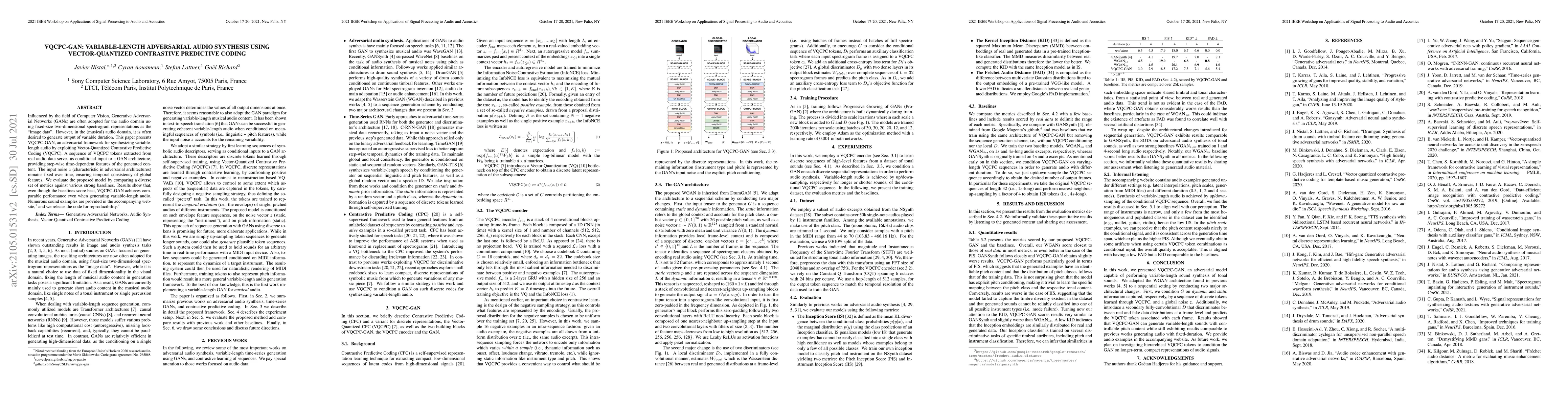 The paper proposes VQCPC-GAN, an adversarial framework for synthesizing variable-length audio using Vector-Quantized Contrastive Predictive Coding (VQCPC). It conditions a GAN on a sequence of VQCPC tokens extracted from real audio data, providing time-dependent features for generated content, while maintaining temporal consistency with fixed input noise.