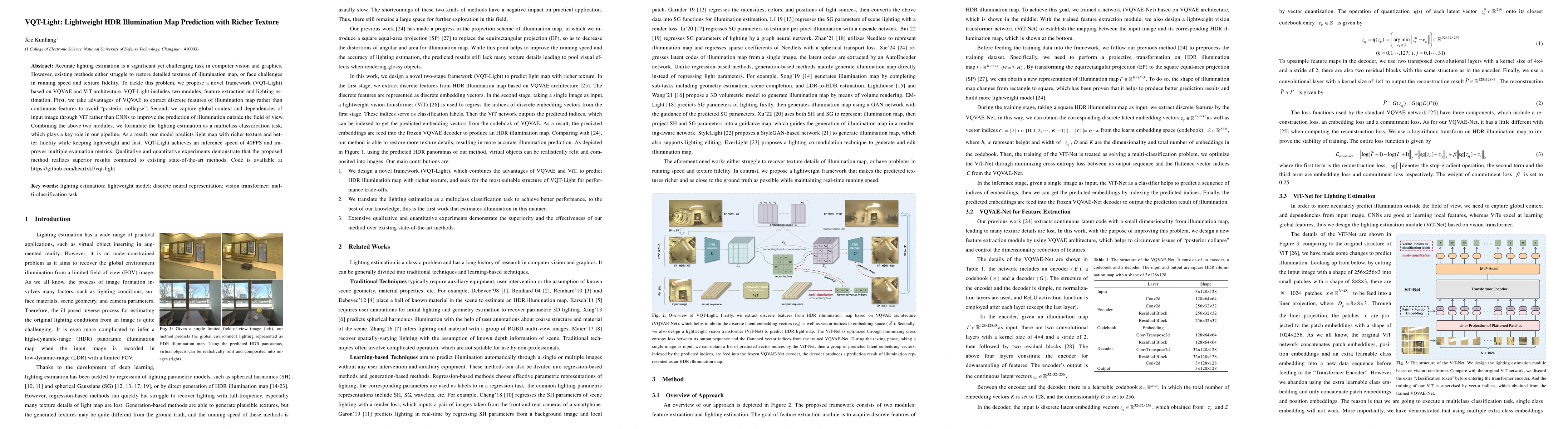 This work is novel in combining VQ-VAE with ViT for lighting estimation, translating an under-constrained problem into a classification task, and achieving high-quality real-time results through careful parameter optimization and architectural design.