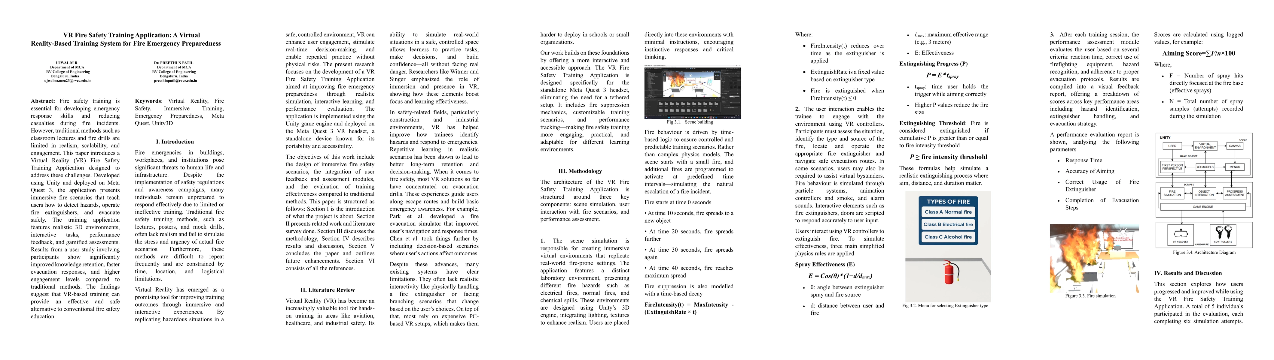 Fire emergencies can happen without warning and knowing how to respond quickly can save lives Unfortunately traditional fire drills can be disruptive costly and often fail to recreate the pressure of a real emergency This project introduces a Virtual Reality VR Fire Safety Training Application that gives people a safe yet realistic way to practice life saving skills Using a VR headset and motion controllers trainees step into a 3D world where fire hazards smoke and evacuation routes are brought to life They can learn how to use a fire extinguisher find safe exits and make decisions under pressure without any real danger The training adapts to the users skill level and tracks progress making it useful for beginners and experienced personnel alike By turning fire safety into an interactive experience this VR approach boosts confidence improves retention and makes learning both safer and more engaging
