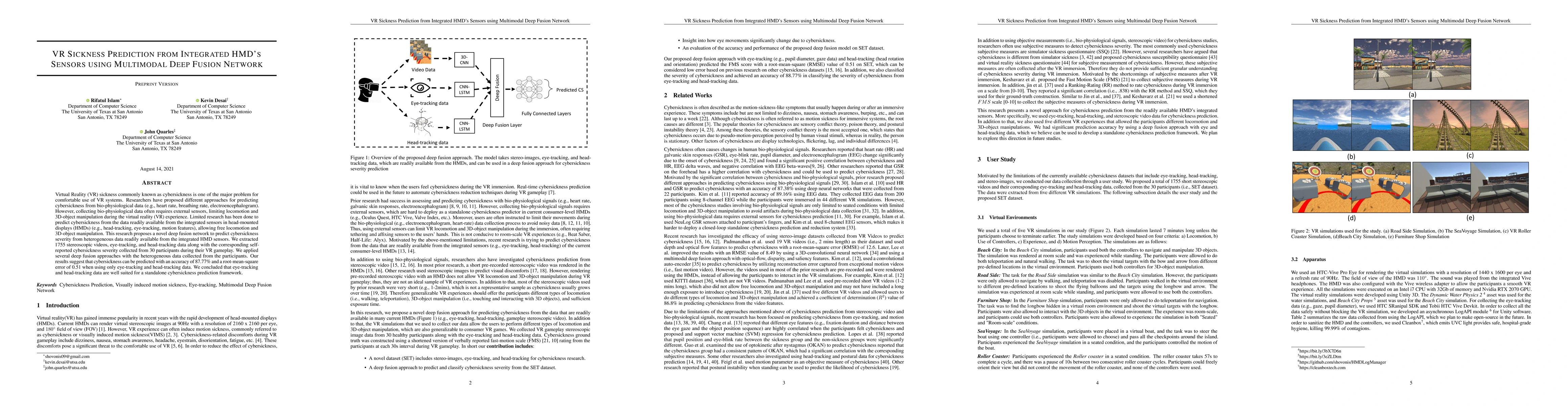 This research proposes a deep fusion network to predict VR sickness (cybersickness) from integrated HMD sensors, specifically eye-tracking and head-tracking data, achieving 87.77% accuracy. This approach allows for free VR interaction without external bio-physiological sensors.
