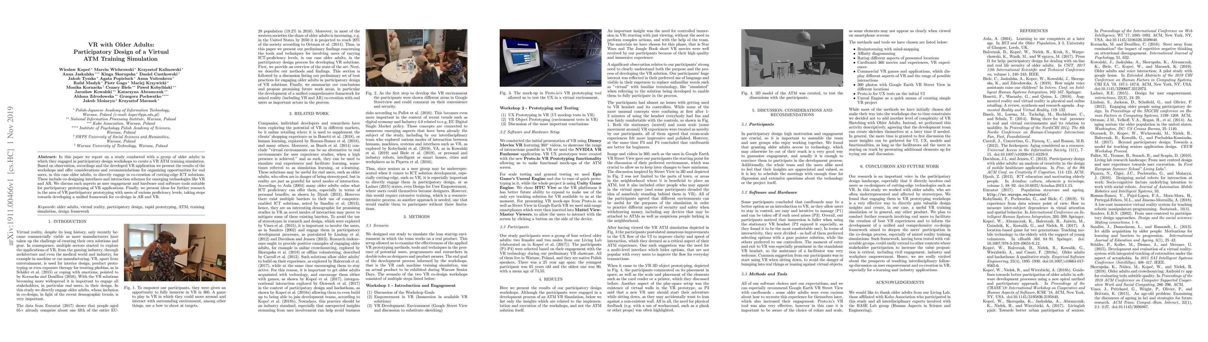 This study explores how older adults can engage in participatory design to create a VR ATM training simulation, highlighting user engagement and suitable tools for co-creation. The research offers recommendations for involving end users in developing cutting-edge ICT solutions, with implications for future frameworks in AR and VR co-design.