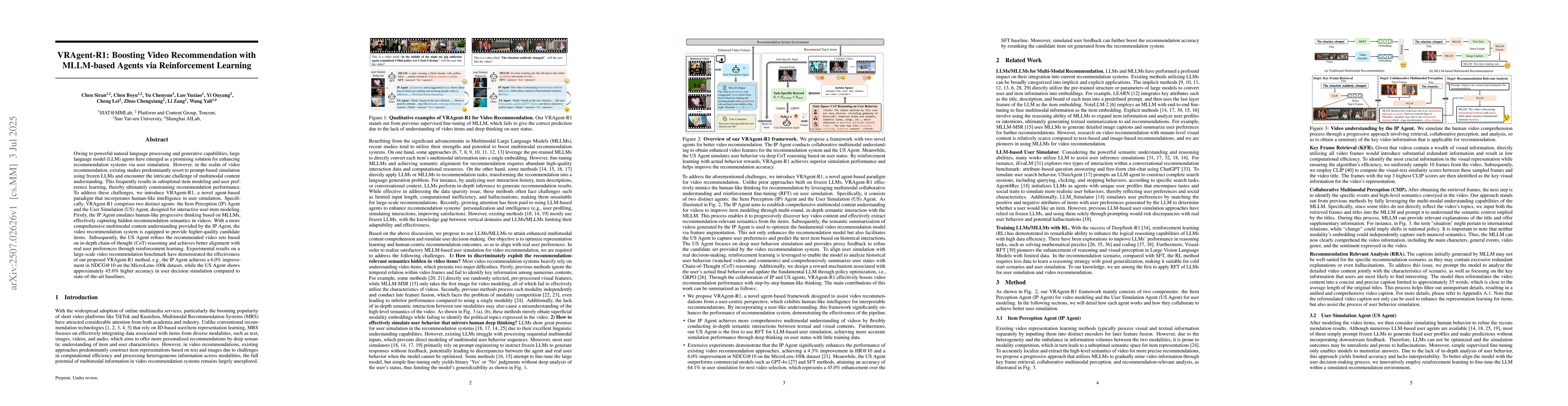 Owing to powerful natural language processing and generative capabilities, large language model (LLM) agents have emerged as a promising solution for enhancing recommendation systems via user simulation. However, in the realm of video recommendation, existing studies predominantly resort to prompt-based simulation using frozen LLMs and encounter the intricate challenge of multimodal content understanding. This frequently results in suboptimal item modeling and user preference learning, thereby ultimately constraining recommendation performance. To address these challenges, we introduce VRAgent-R1, a novel agent-based paradigm that incorporates human-like intelligence in user simulation. Specifically, VRAgent-R1 comprises two distinct agents: the Item Perception (IP) Agent and the User Simulation (US) Agent, designed for interactive user-item modeling. Firstly, the IP Agent emulates human-like progressive thinking based on MLLMs, effectively capturing hidden recommendation semantics in videos. With a more comprehensive multimodal content understanding provided by the IP Agent, the video recommendation system is equipped to provide higher-quality candidate items. Subsequently, the US Agent refines the recommended video sets based on in-depth chain-of-thought (CoT) reasoning and achieves better alignment with real user preferences through reinforcement learning. Experimental results on a large-scale video recommendation benchmark have demonstrated the effectiveness of our proposed VRAgent-R1 method, e.g., the IP Agent achieves a 6.0\% improvement in NDCG@10 on the MicroLens-100k dataset, while the US Agent shows approximately 45.0\% higher accuracy in user decision simulation compared to state-of-the-art baselines.